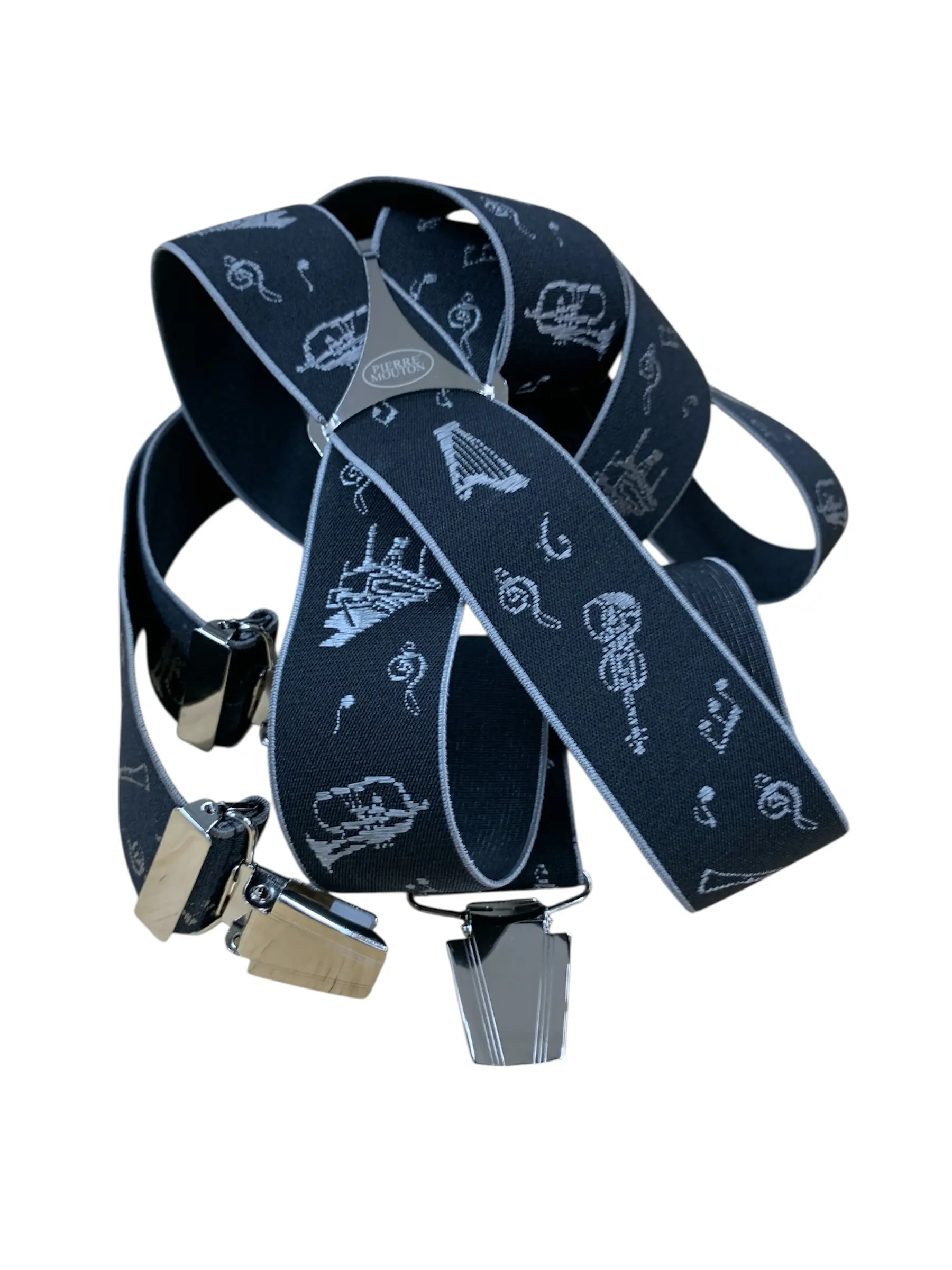 Extra lange bretels in blauw met muziek instrumenten. Bretels zijn 140cm lang en 4cm breed met vier stevige klippen en een metalen rugstuk.