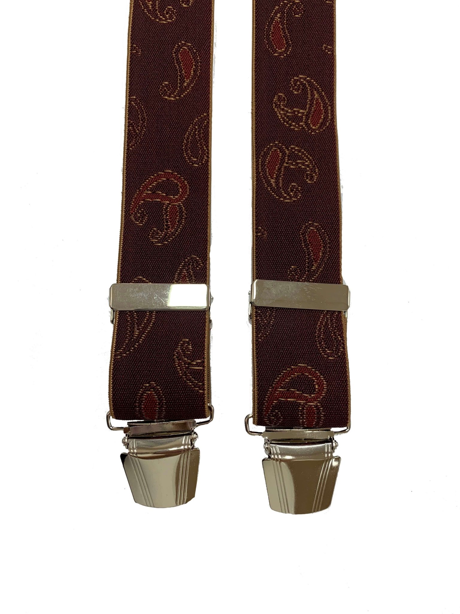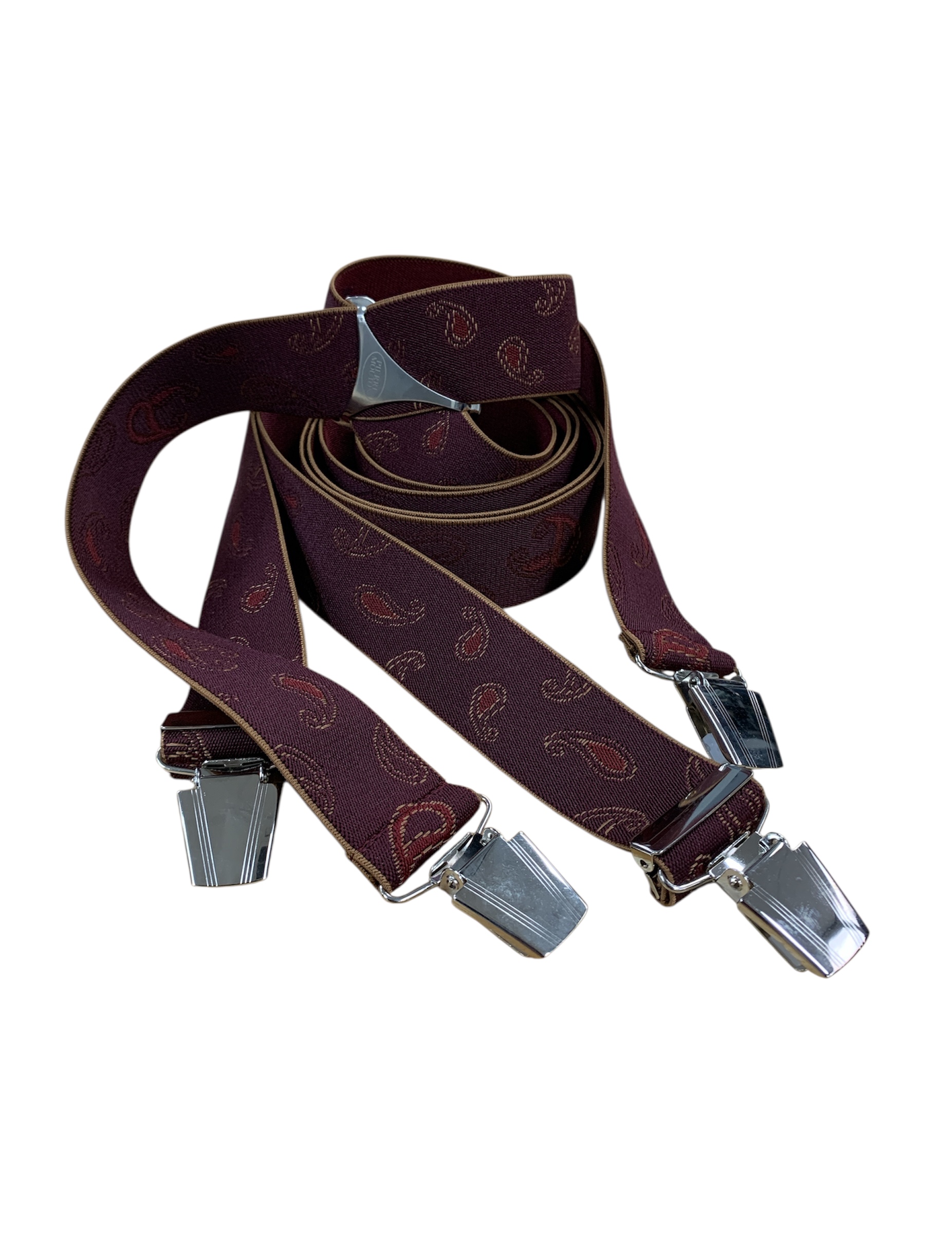 Extra lange bretels in bordeauxrood met paisley motiefje. Bretels zijn 140cm lang en 4cm breed met vier stevige klippen en een metalen rugstuk.