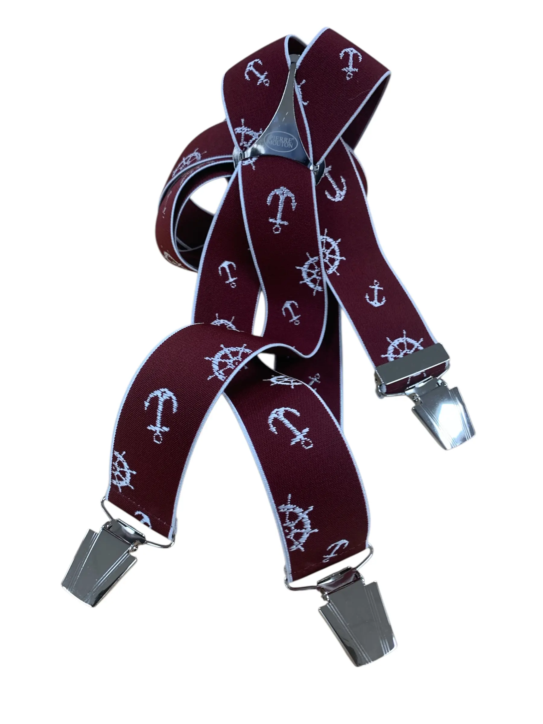 Extra lange bretels in rood met anker en stuurwiel. Bretels zijn 140cm lang en 4cm breed met vier stevige klippen en een metalen rugstuk.
