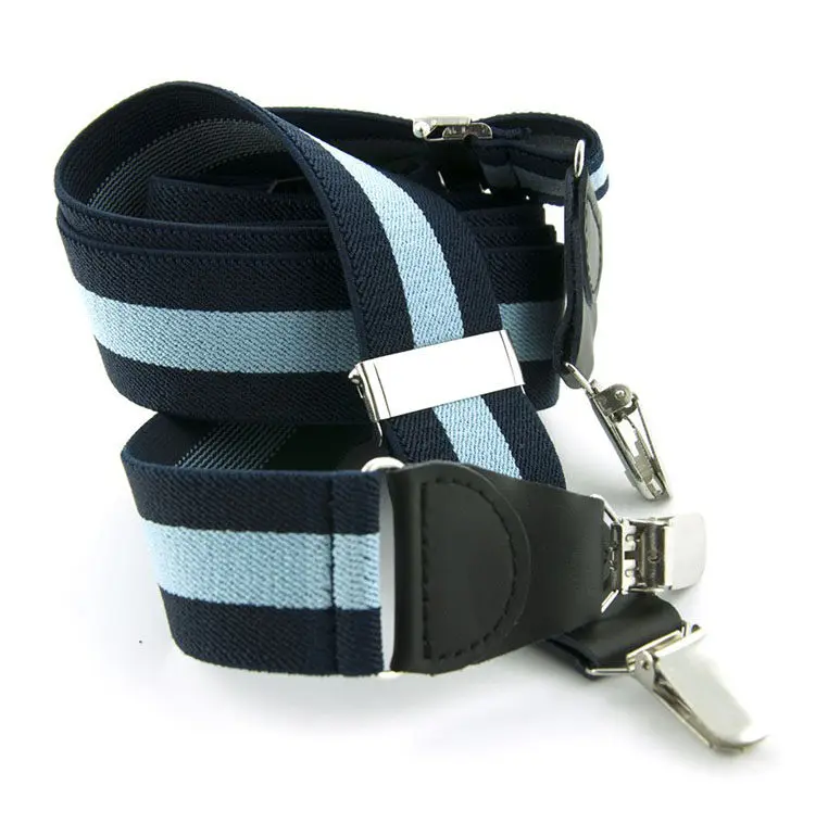 Bretels in een donkerblauw en lichtblauwe lengte streep. Bretels 110cm standaard lengte en 3,5cm breed met drie klippen.