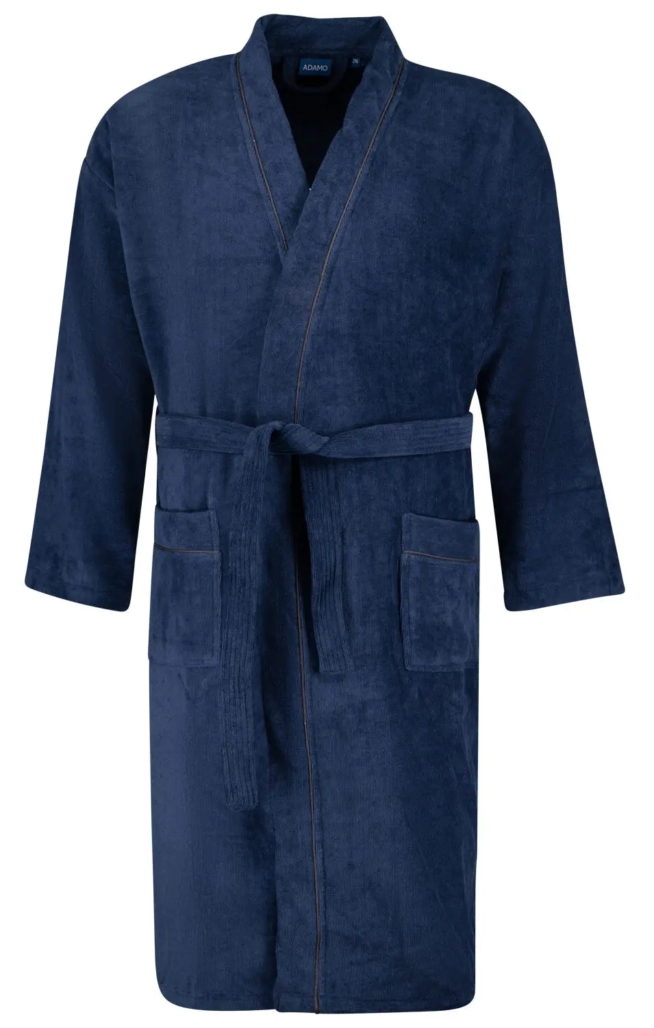 Adamo grote maat badjas donkerblauw velours. De uiterst comfortabele en aangenaam zacht en warm model kamerjas van Adamo is verkrijgbaar in donkerblauw en in grote maten van 3XL t/m 8XL. Het huidvriendelijke, ademende materiaal, de extra grote pasvorm en de praktische ceintuur zorgen voor een hoog draagcomfort 100% katoen.