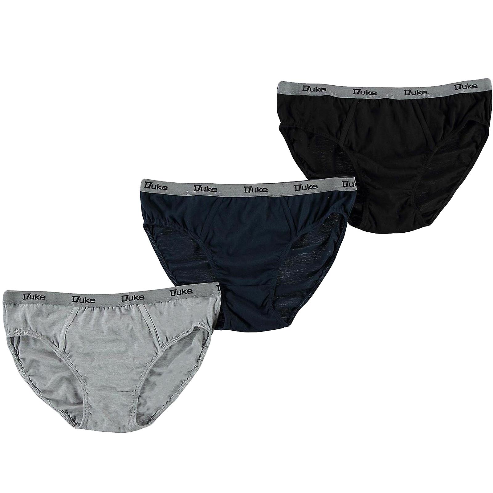 Duke slips 3 stuks verpakking waarvan een zwarte slip, een navy slip en een grijze slip. De kwaliteit is 100% katoen.
