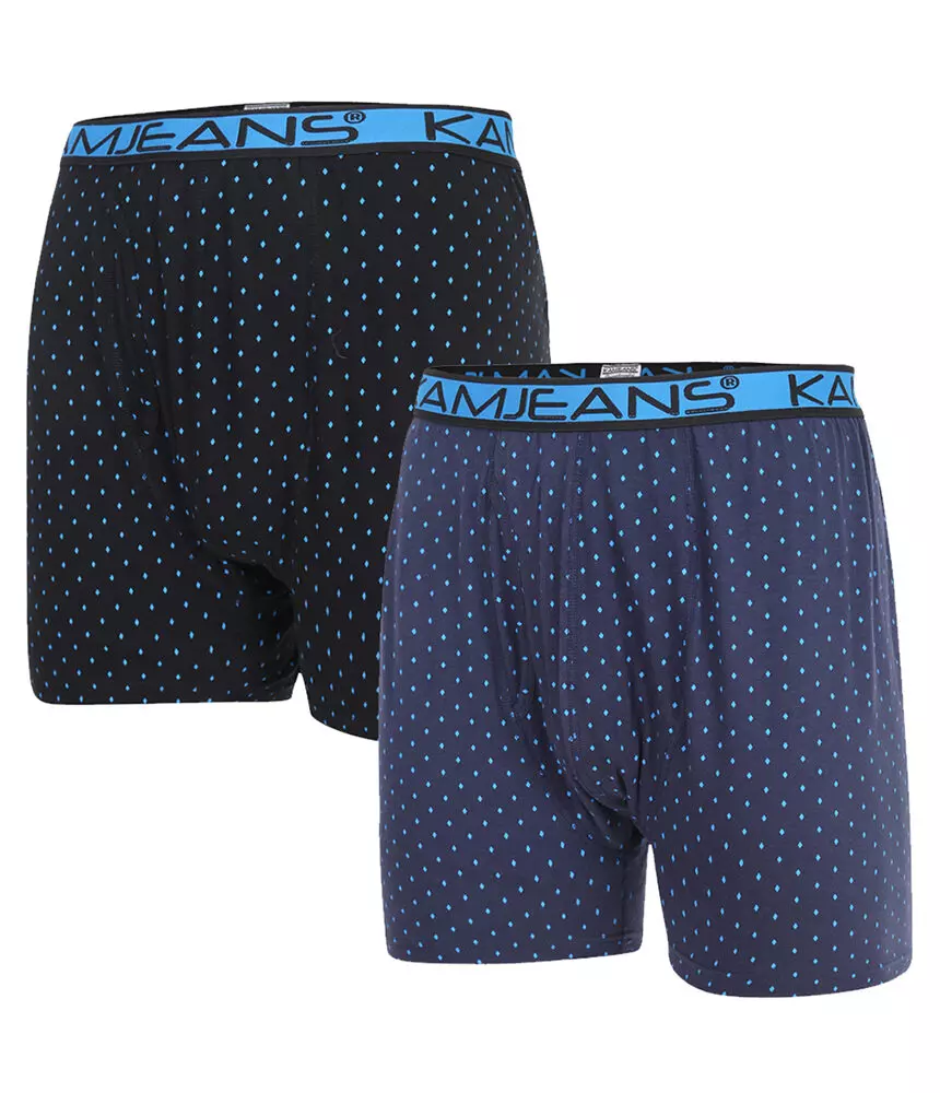 Ontdek de perfecte mix van comfort en stijl met de grote maat boxershorts van Kam! Deze boxershorts zijn speciaal ontworpen voor mannen die op zoek zijn naar een goede pasvorm en een vleugje trendy design in hun ondergoed collectie. De verpakking bevat twee stretch boxershorts, een blauwe en een donkerblauwe, elk met een uniek diamantprintje, zodat je zowel comfortabel als modieus kunt zijn.