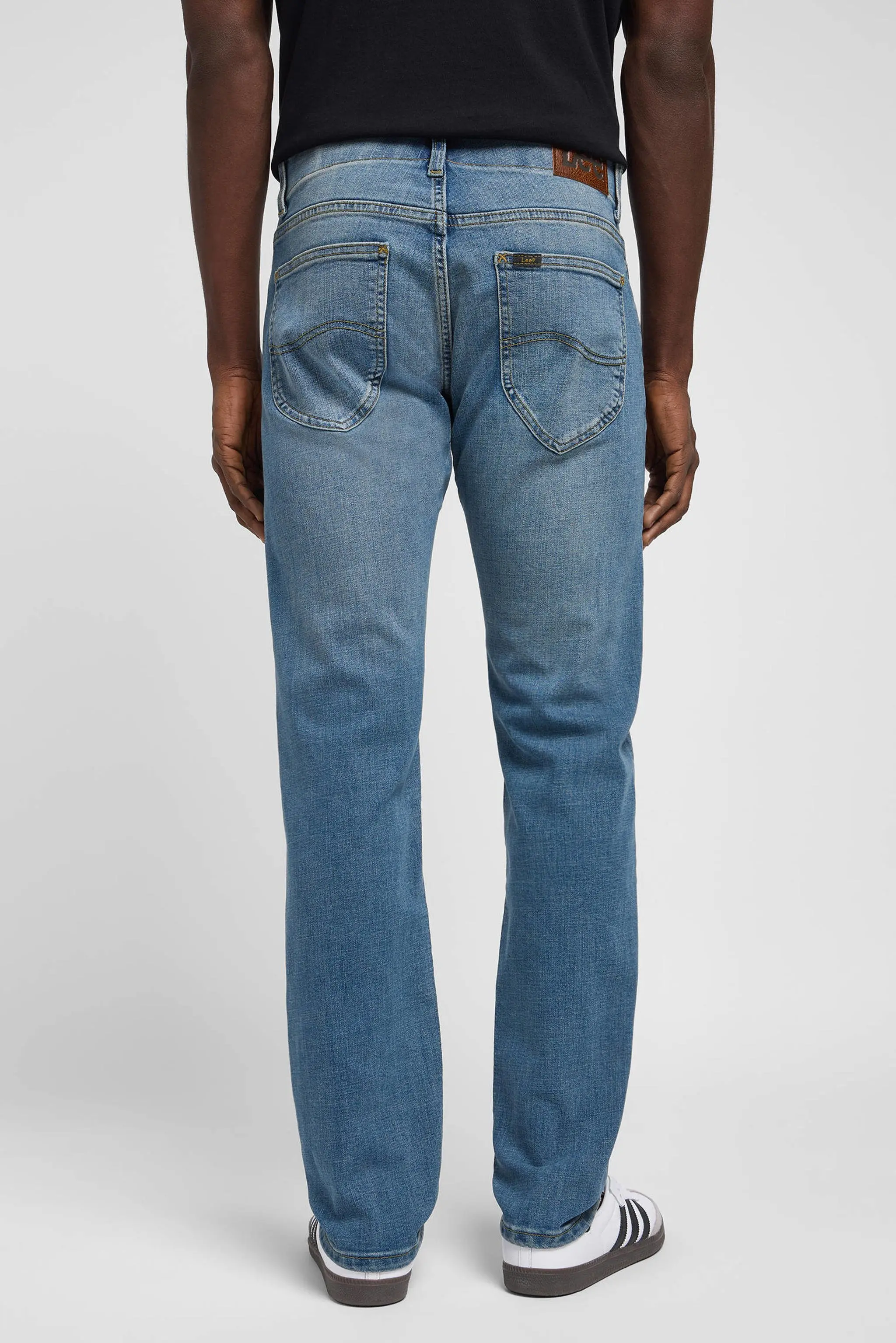 Lee 5 pocket stretch jeans in model Lenny extreem motion slim fit tapered leg.