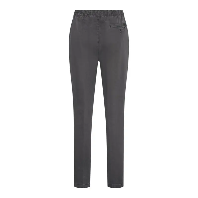 Luigi Morini chino denim joggingjeans met elastische band donkergrijs. De in principe model joggingbroek heeft geen rits en knoop sluiting, maar trekt u gewoon aan als een joggingbroek. Aan de elastische band zitten riem lussen. Deze broek heeft 2 zijzakken en 1 achterzak met knoop sluiting. De kwaliteit is 98% katoen en 2% elastan.