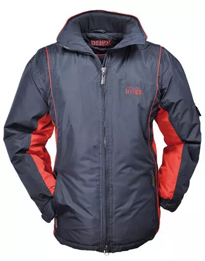 Brigg winter jack donkerblauw en rood met in de kraag een capuchon. Brigg winterjas met fleece voerring aan de binnenkant is winddicht, waterdicht en ademend. Jack heeft twee zijzakken met rits en een zakje met rits op de linker boven arm. Aan de binnenkant 2 zakken met rits en een telefoon zak.