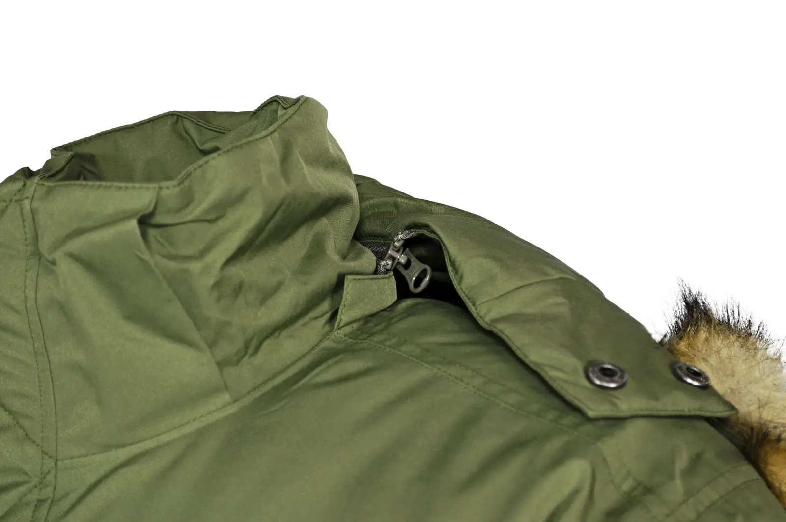 Brigg winter jack in olijfgroen met afneembare capuchon. Jack heeft 4 zakken aan de buitenkant allemaal met rits en een binnenzak met drukker. In de mouwen zitten windvangers en de capuchon met namaak bont is afneembaar.