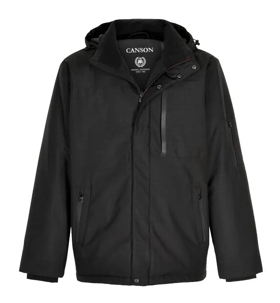 Canson grote maat winter jack antracietgrijs met afneembare capuchon. Jack met 5 zijzakken aan de voorkant waarvan 3 met rits en twee binnenzakken met rits, in de mouwen zitten windvangers en op de linker mouw ook een zakje met rits .Jack is winddicht, ademend en waterafstotend.