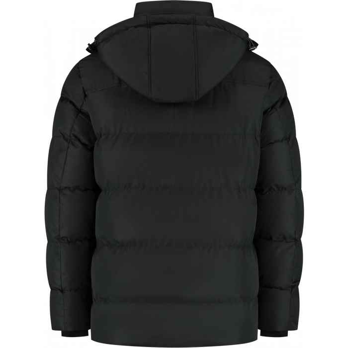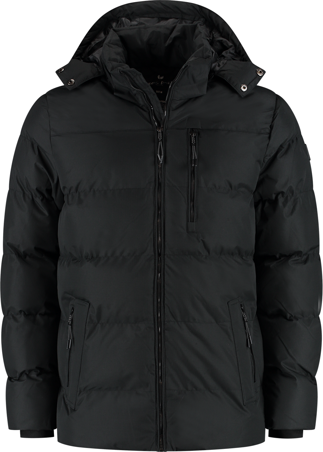 Pre End parka jack zwart. Jack heeft 3 zakken met rits aan de voorkant. Aan de binnenkant zitten 2 binnenzakken met drukker. In de mouwen van de jas zitten windvangers, ook heeft de jas een afneembare capuchon. Jas is winddicht en waterafstotend.