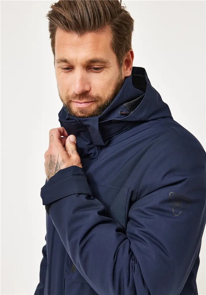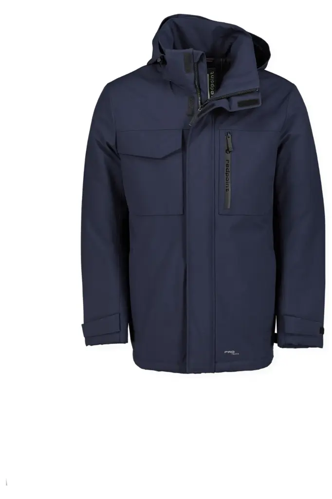 Redpoint winterjas donkerblauw met vaste capuchon. Mooie kwaliteit winterjas in heeft een vaste capuchon. Winterjack met 4 zakken aan de buitenkant waarvan 3 met rits en 2 binnenzakken waarvan een met rits. Kwaliteit is 100% polyester winddicht, waterdicht en ademend.