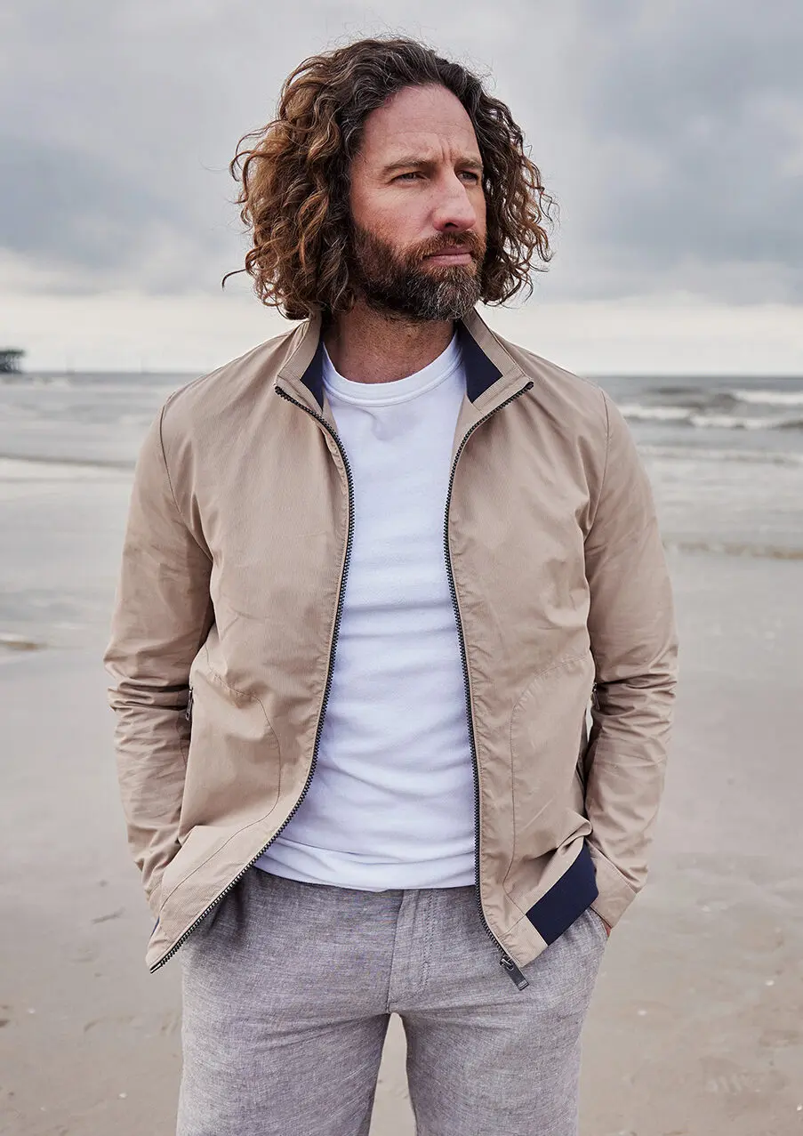 Redpoint zomer jack in beige met een een fijn lengte streepje met blauw accenten. Jack heeft 2 zakken aan de buitenkant met rits en 2 binnenzakken waarvan 1 met rits. Machine wasbaar op 40graden.