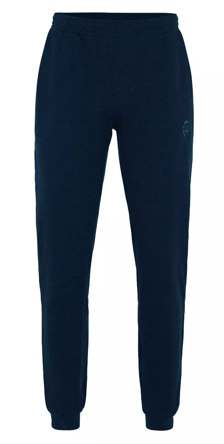 Ahorn joggingbroek donkerblauw met boord. Lekker zittende sport, vrije tijds, huisbroek van het merk Ahorn Sportswear, Joggingbroek met 2 zakken aan de zijkant van de broek zonder rits, dubbel elastieken taille boord met aan snoer koord en tricot manchetten aan de onderkant van de pijp. De kwaliteit is 100%katoen.