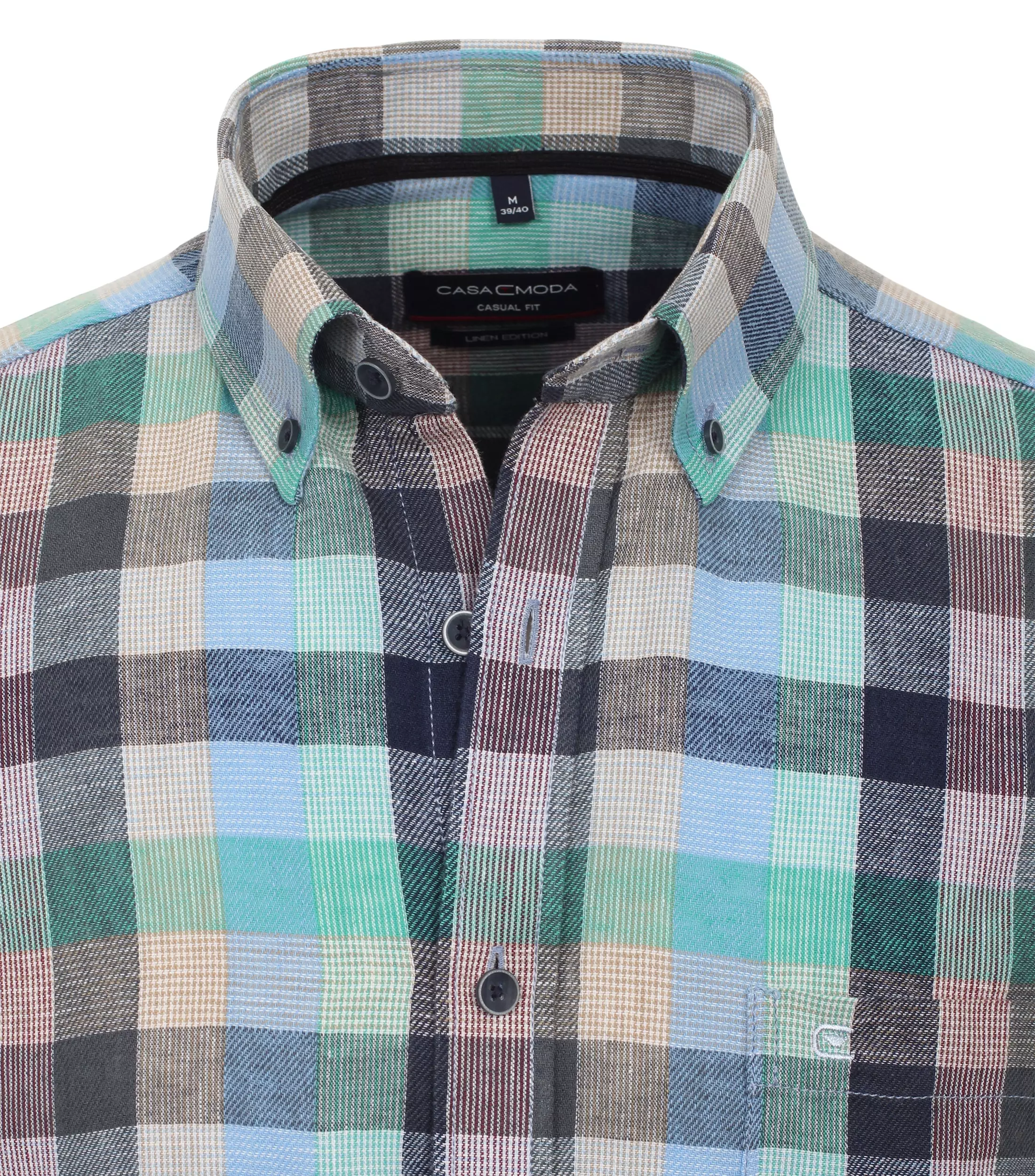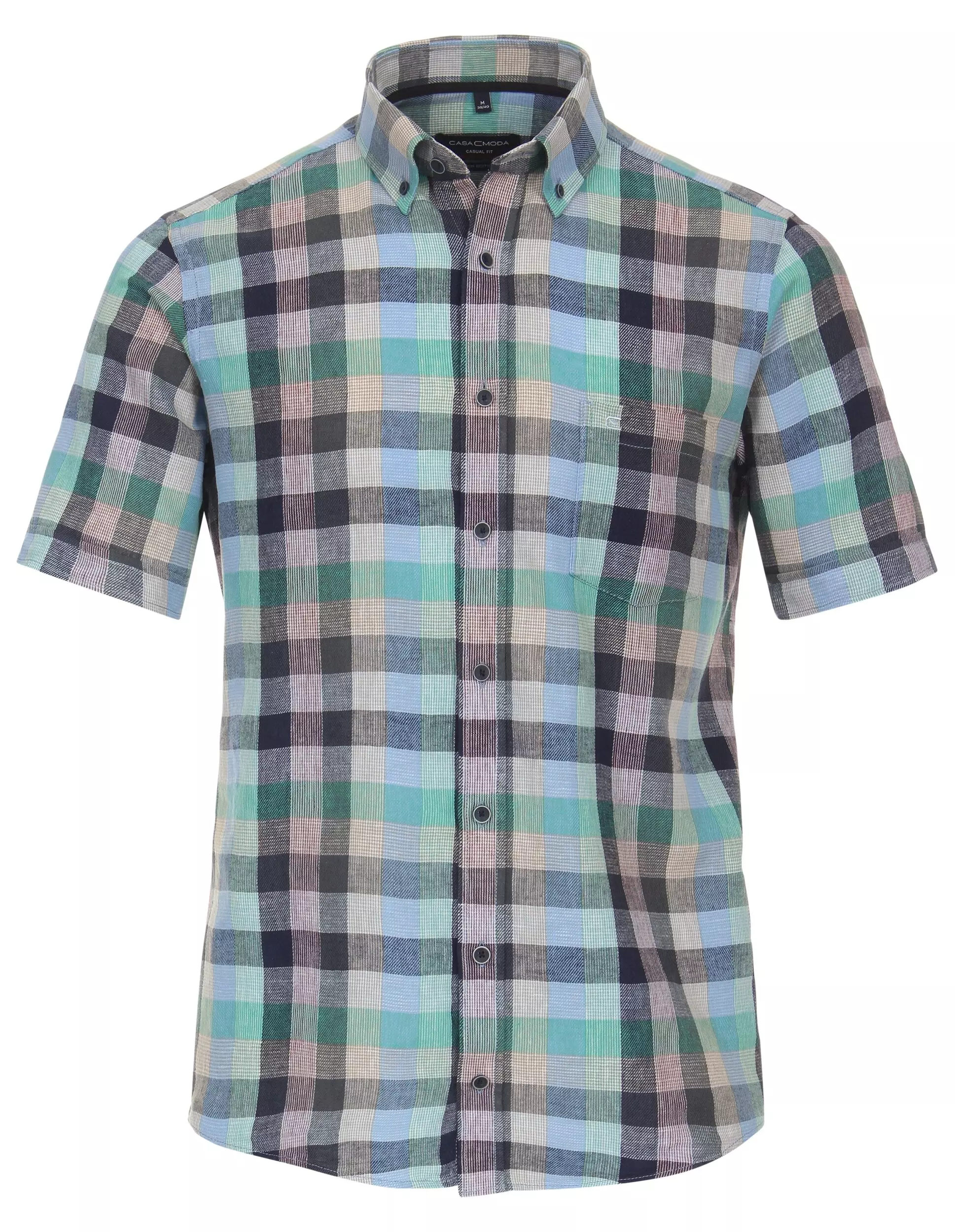 Casa Moda overhemd korte mouw met borstzakje in een blauw en groen ruit met kraag button down. De kwaliteit is 45% katoen en 55% linnen in model casual fit over de broek dragend.