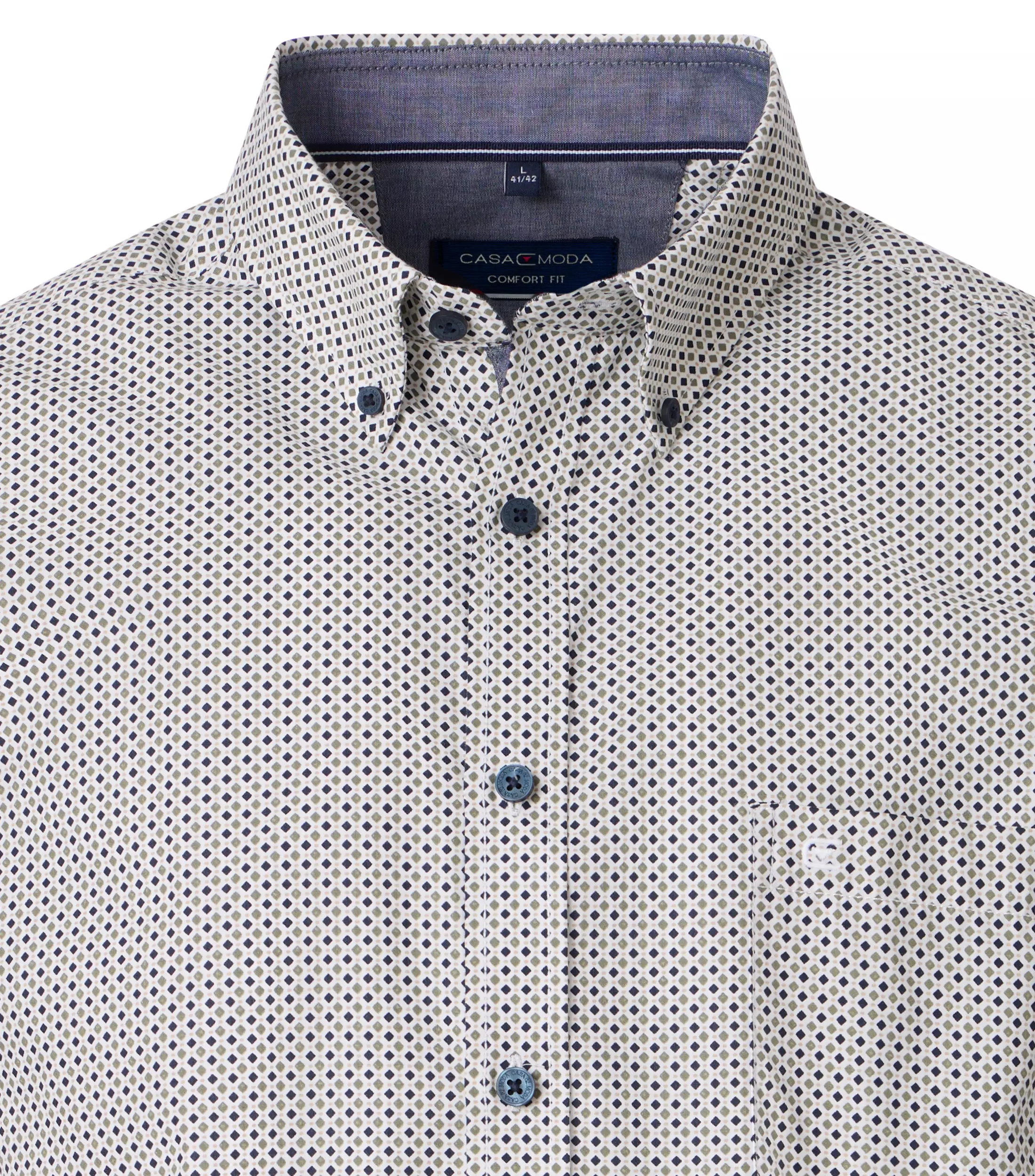 Casa Moda overhemd korte mouw blauw en olijfgroen fantasie design. Overhemd met borstzakje en kraag button down in model comfort fit 100% katoen.