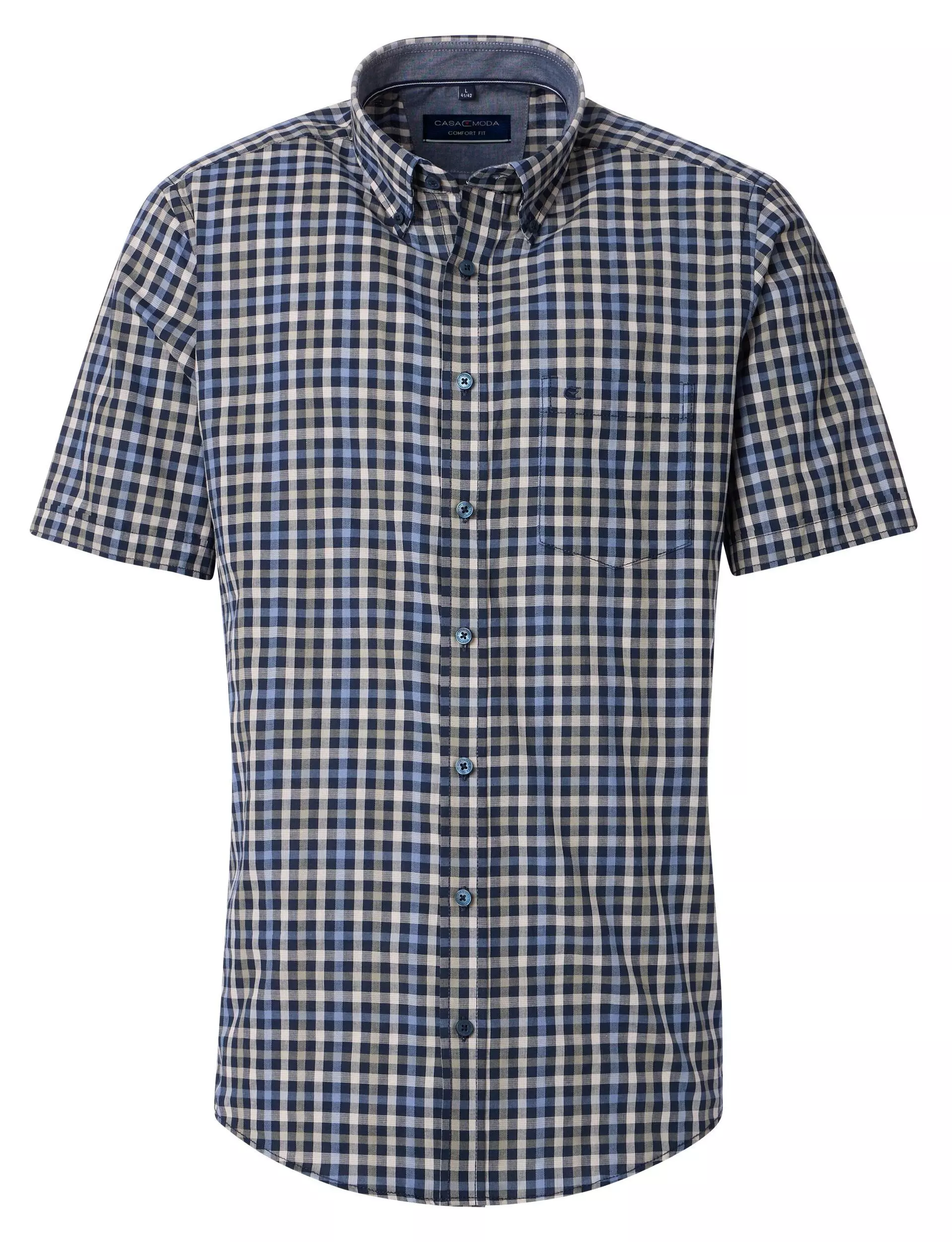 Casa Moda overhemd korte mouw blauw en olijfgroen ruit design. Overhemd met borstzakje en kraag button down in model comfort fit 100% katoen.