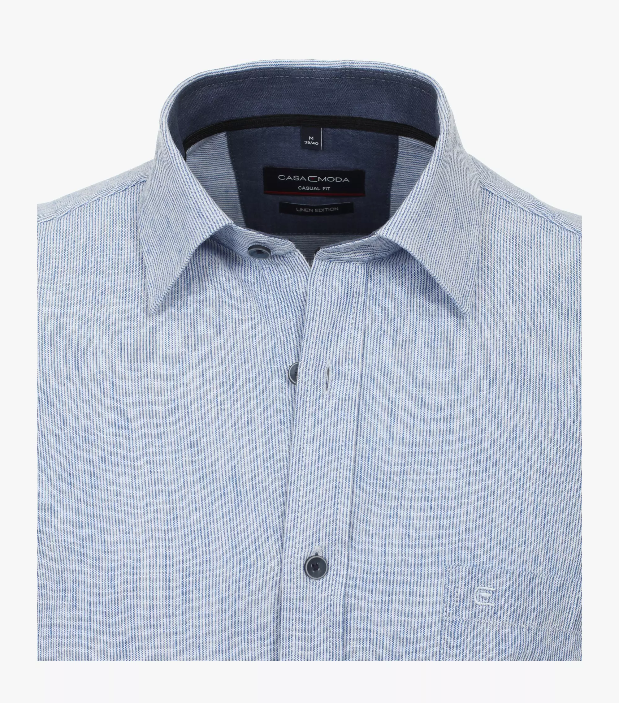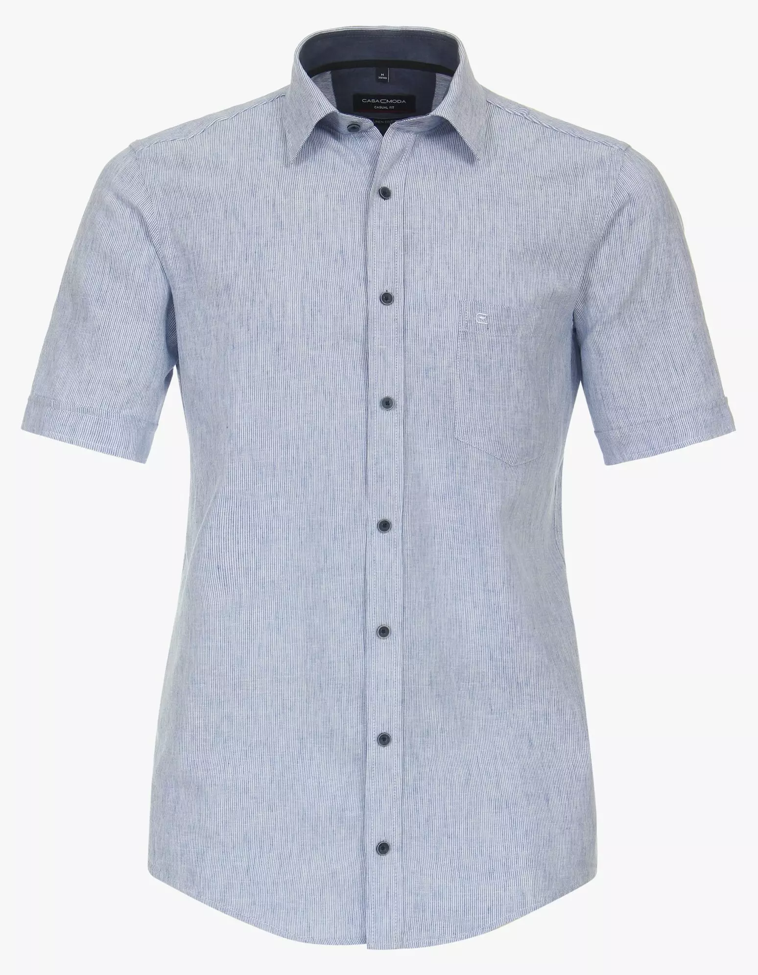 Casa Moda overhemd korte mouw in een blauw en wit lengte streepje. Overhemd met borstzakje en binnenkant kraag met een contrasterend stofje afgewerkt. De kwaliteit is 55% Linnen, 45% katoen in model casual fit over de broek dragend.