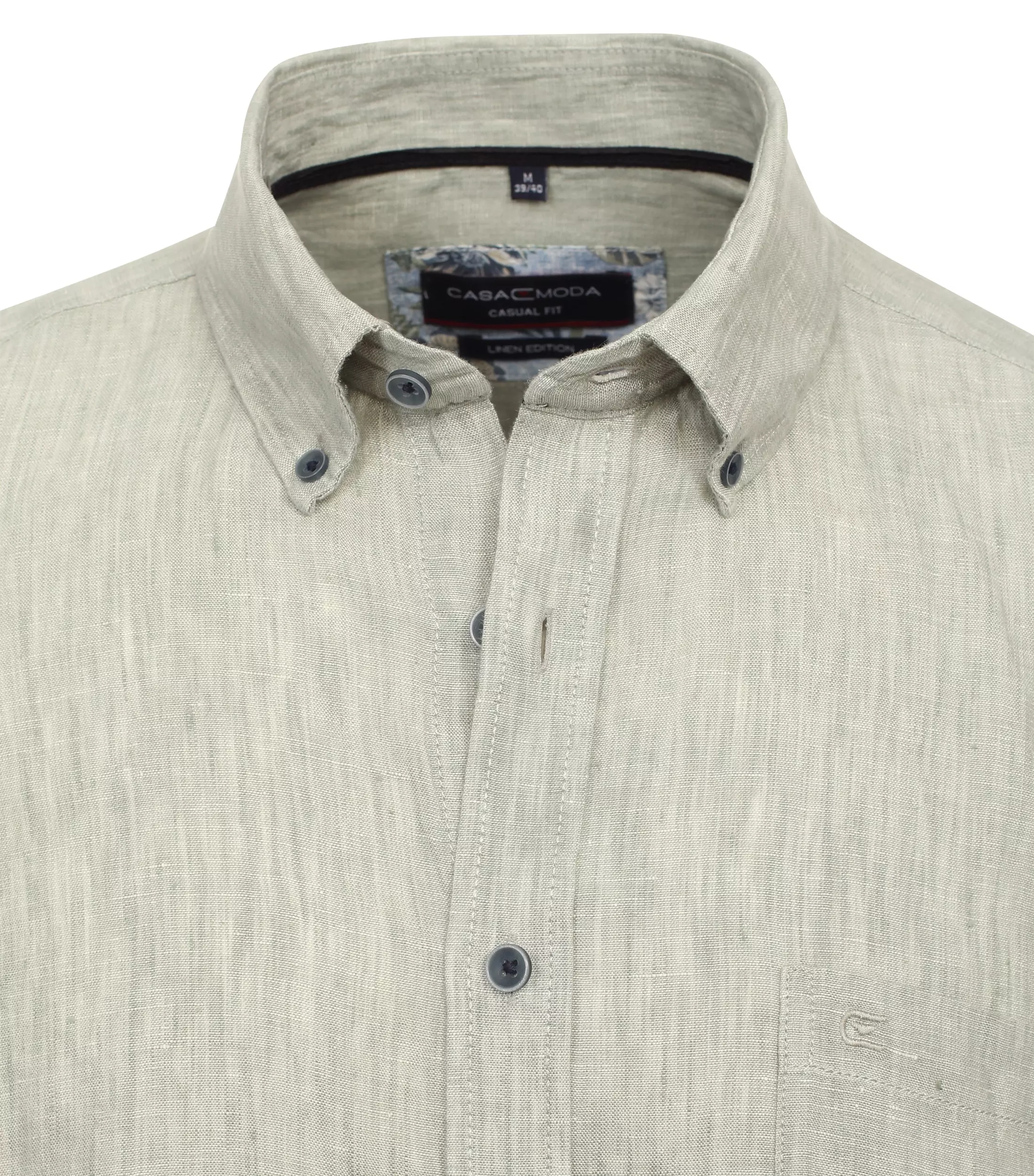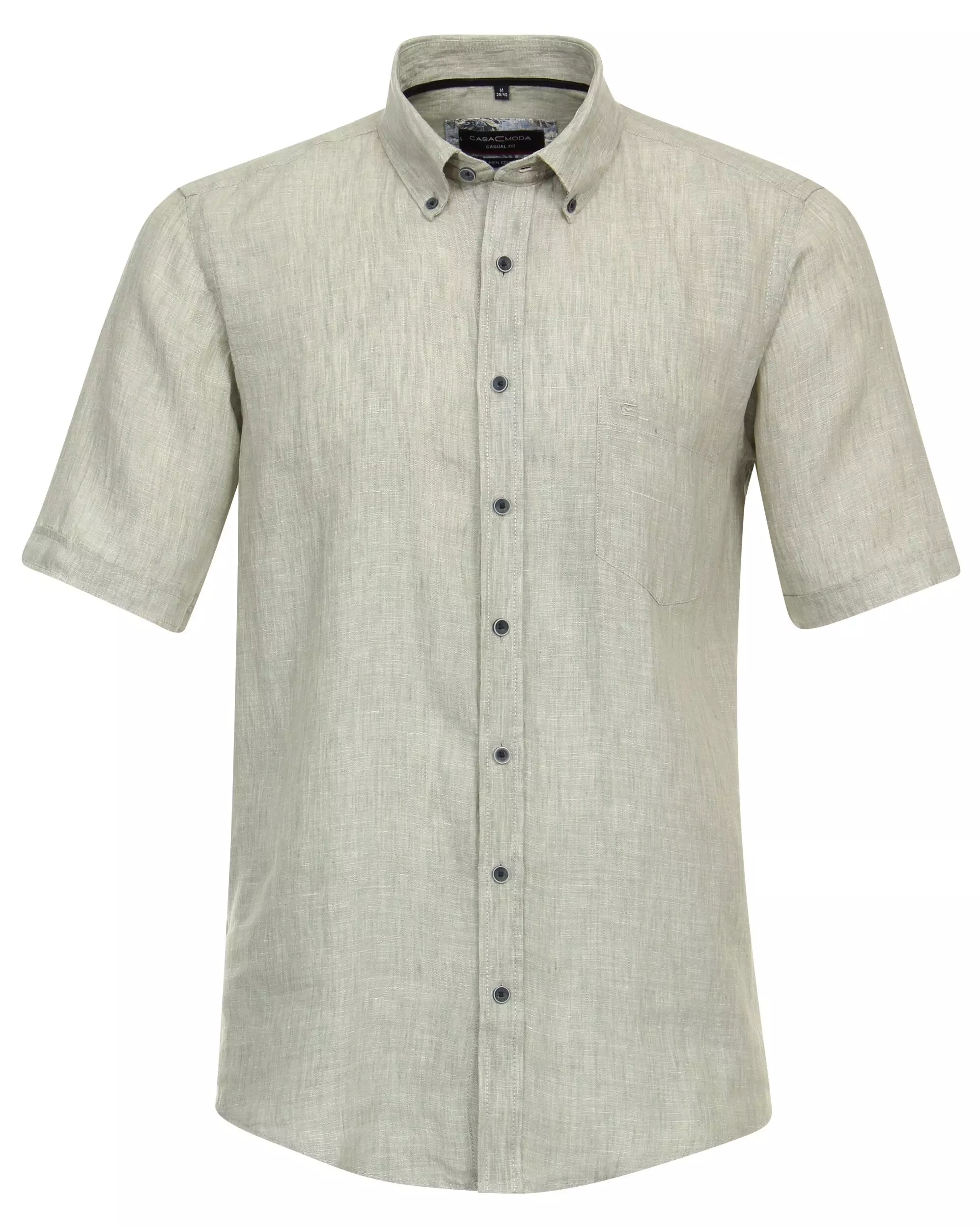 Casa Moda overhemd korte mouw met borstzakje in groen met kraag button down. De kwaliteit is 100% linnen model casual fit over de broek dragend.