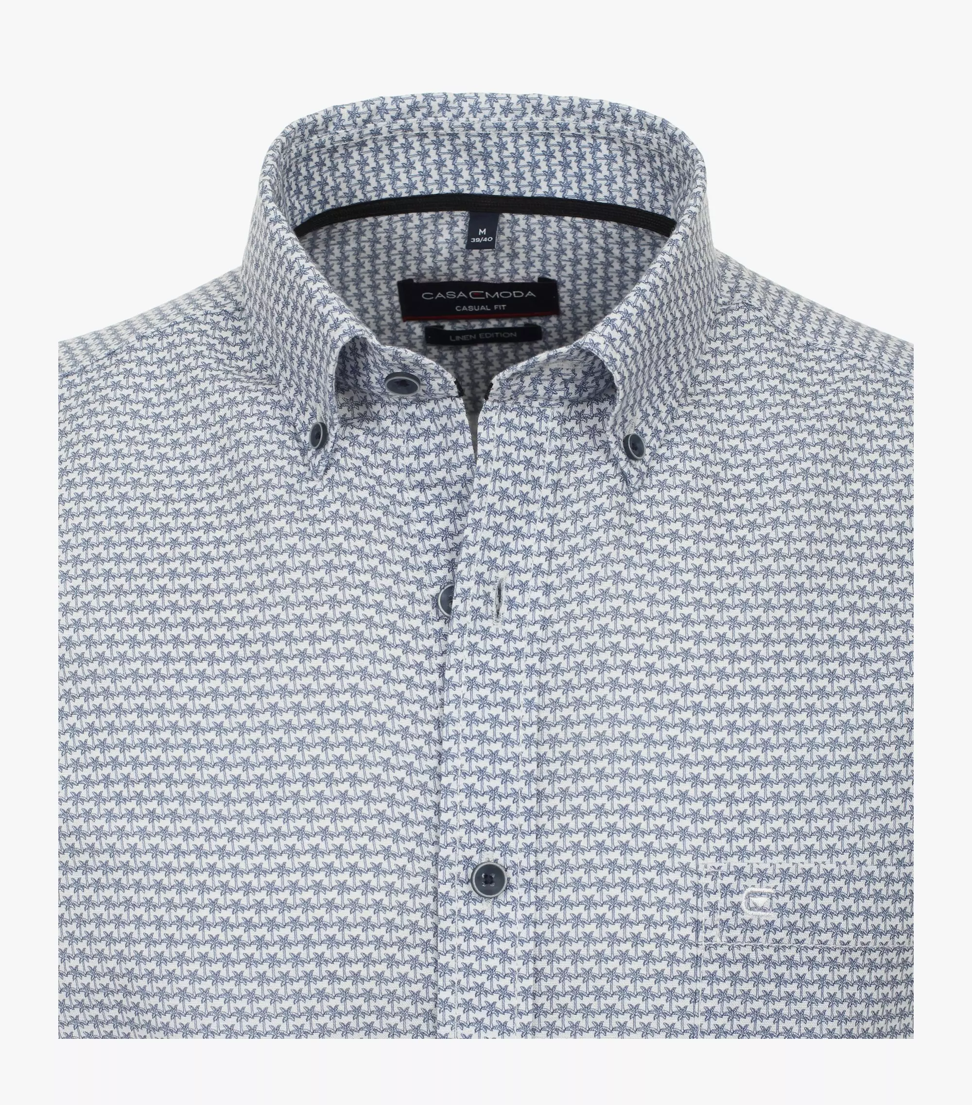 Casa Moda overhemd korte mouw met borstzakje in een blauw en wit palmboompjes design. De kwaliteit is 40% katoen en 60% linnen model casual fit over de broek dragend.