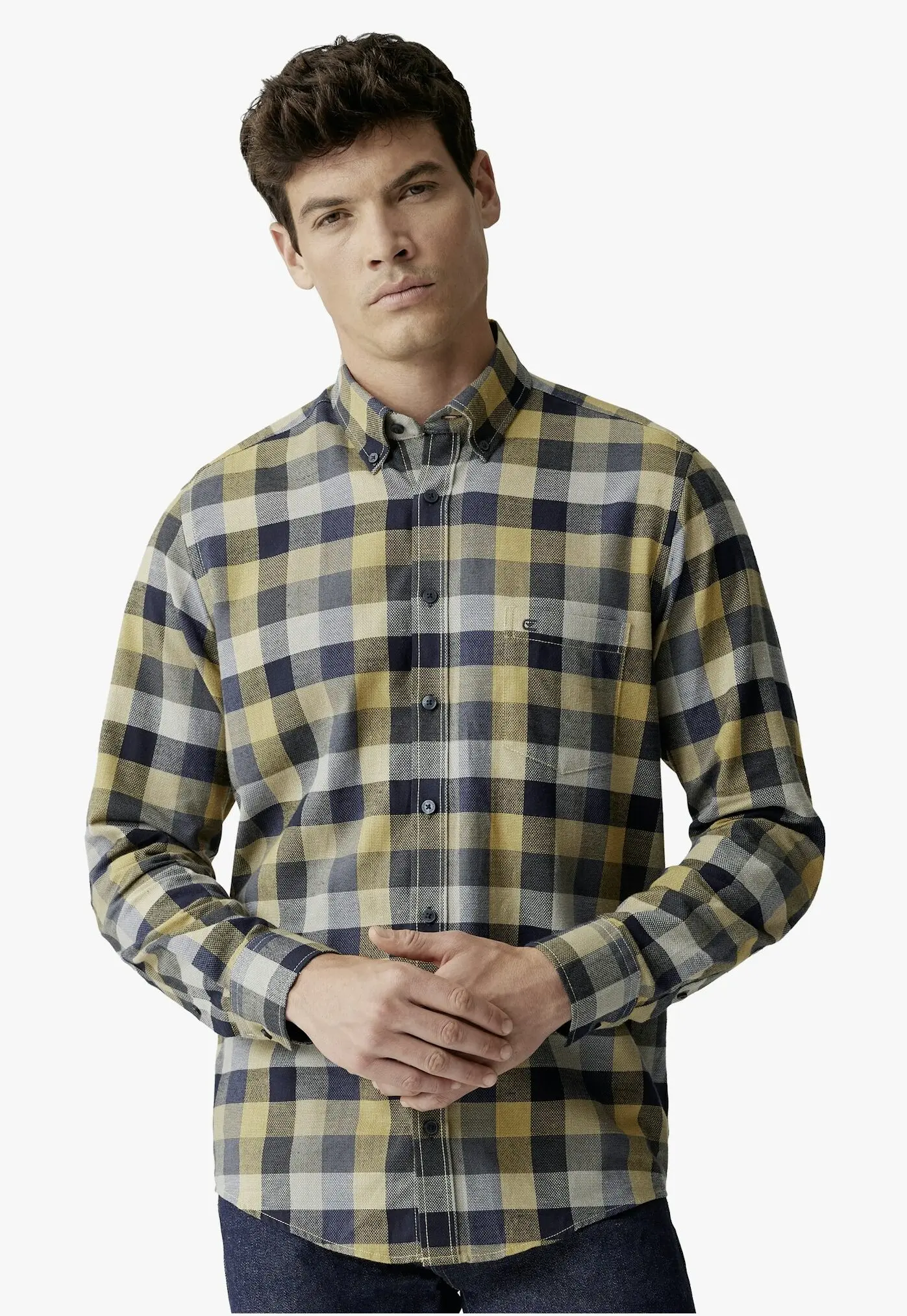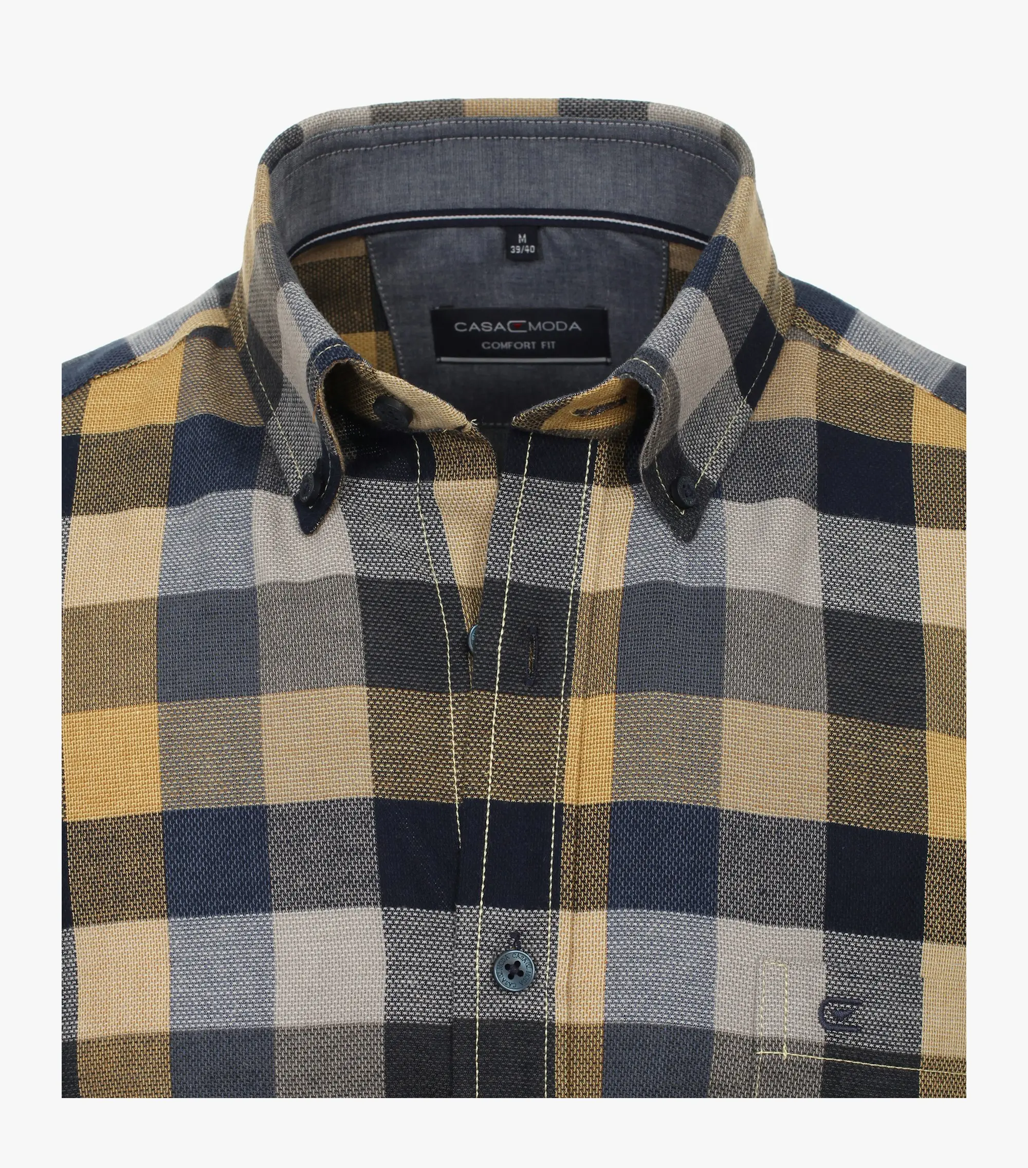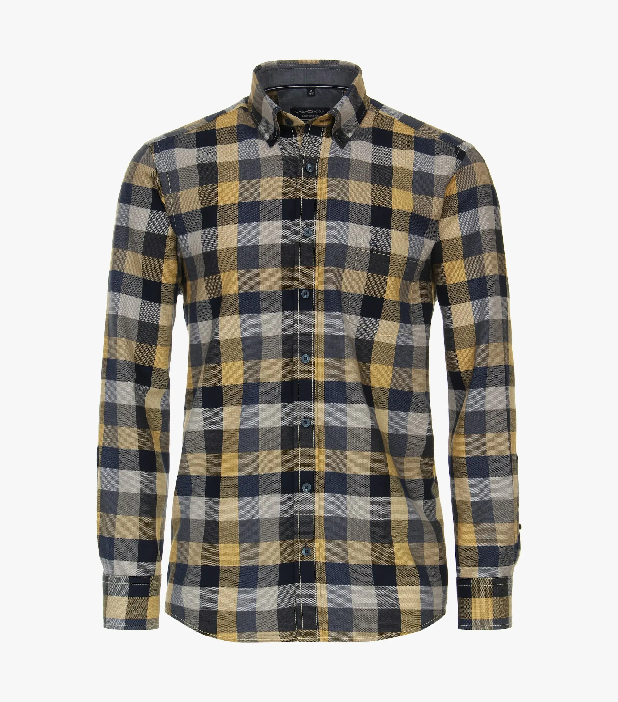 Casa Moda overhemd lange mouw met borstzakje en kraag button down in een blauw en gele ruit. De kwaliteit is 100% katoen in model casual fit.