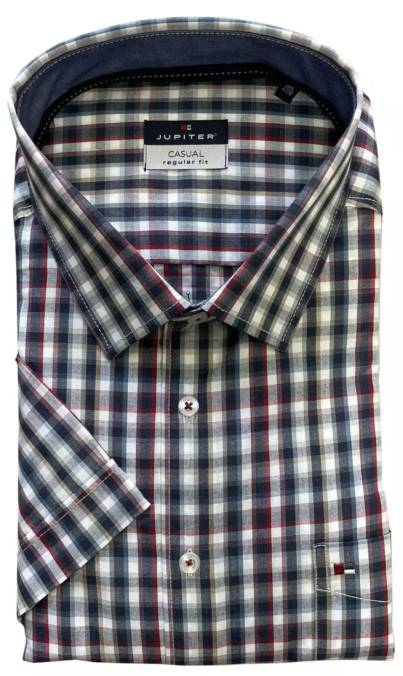 Jupiter overhemd korte mouw met borstzakje in een wit met rood en beige ruit. De kwaliteit is 100% katoen in model regular fit.
