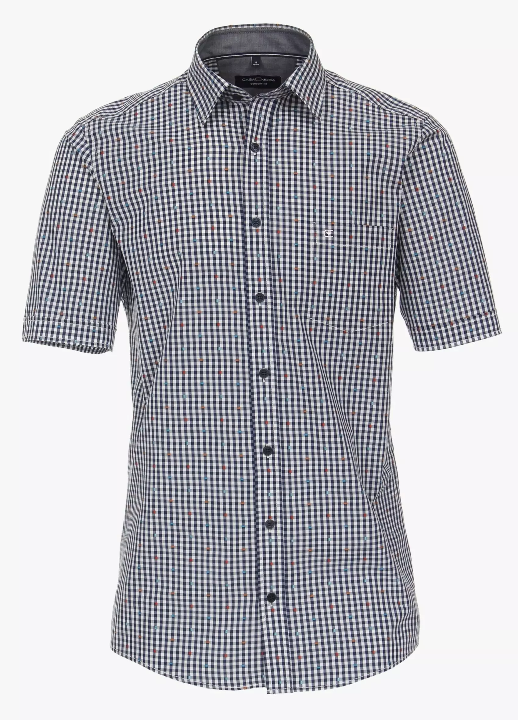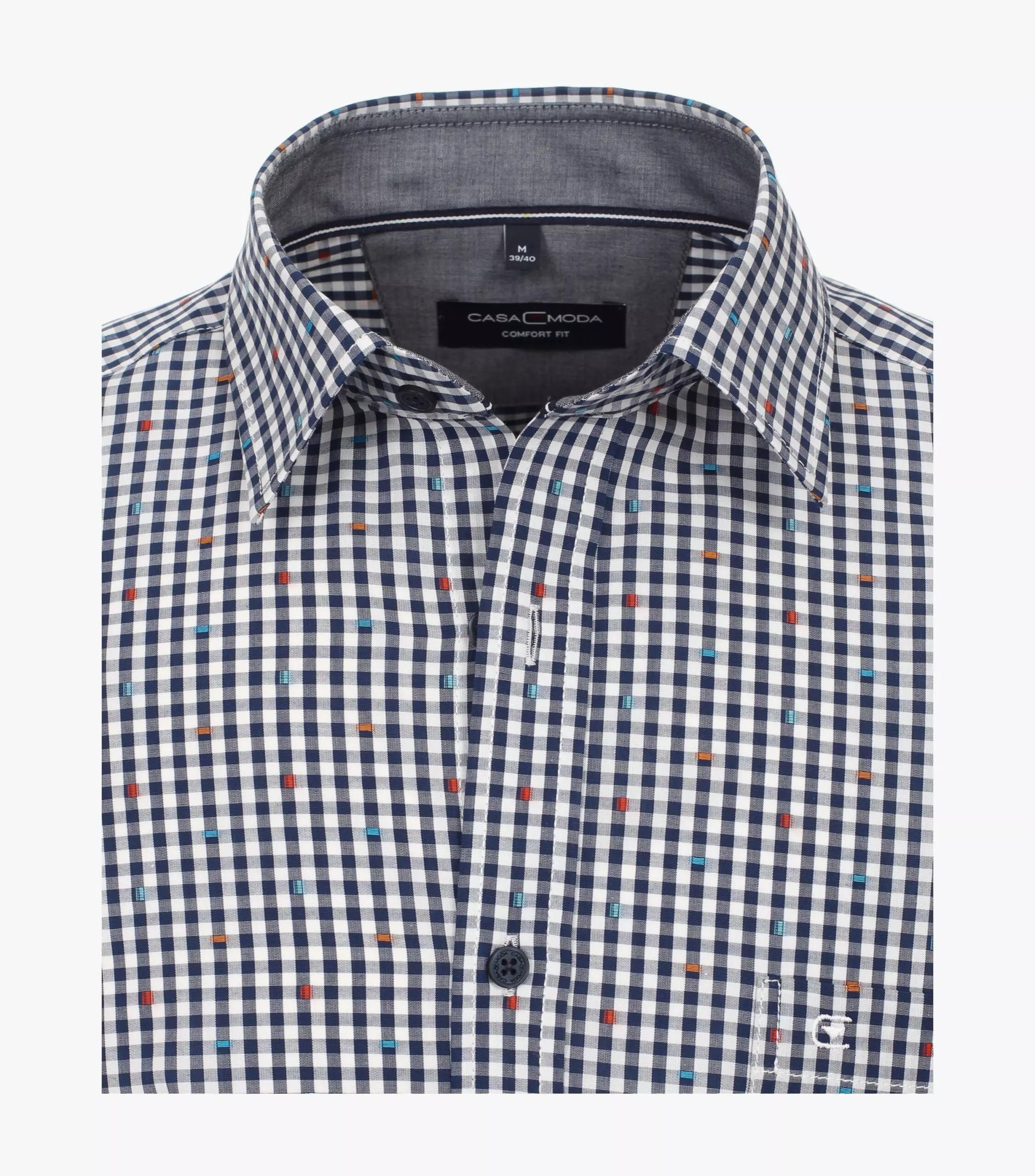 Casa Moda overhemd korte mouw met borstzakje in een donkerblauw en wit ruitje met hier en daar een gekleurd blokje. De kwaliteit is 100% katoen in casual fit.