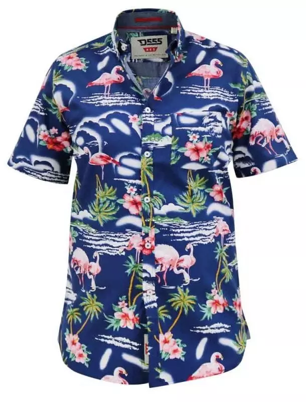 D555 grote maat korte mouw Hawaii overhemd met borstzak donkerblauw flamingo design. De kwaliteit van dit overhemd is 100% katoen.