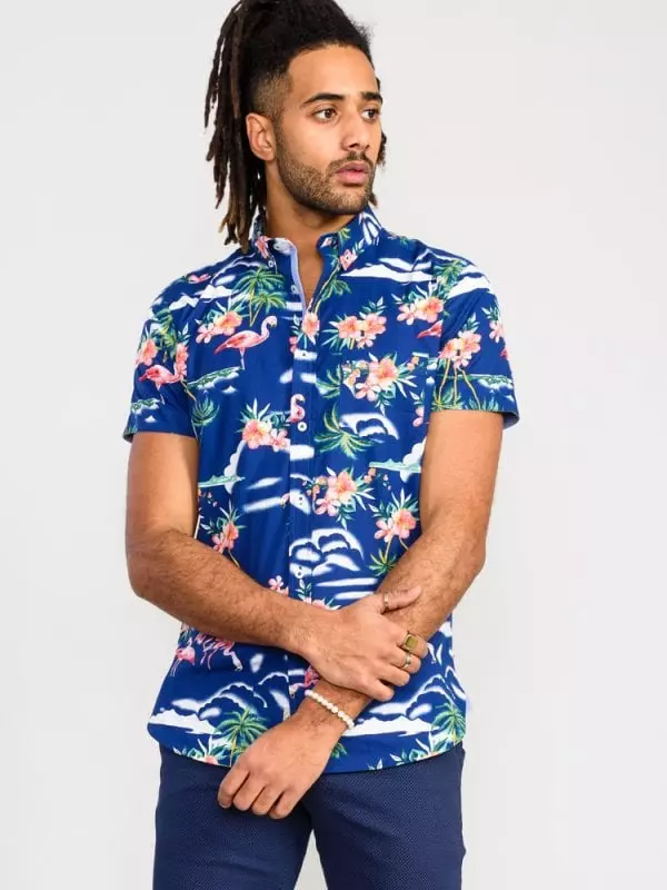 D555 korte mouw Hawaii overhemd met borstzak en kraag button down in donkerblauw met bloemen en flamingo design. De kwaliteit van dit overhemd is 100% katoen.