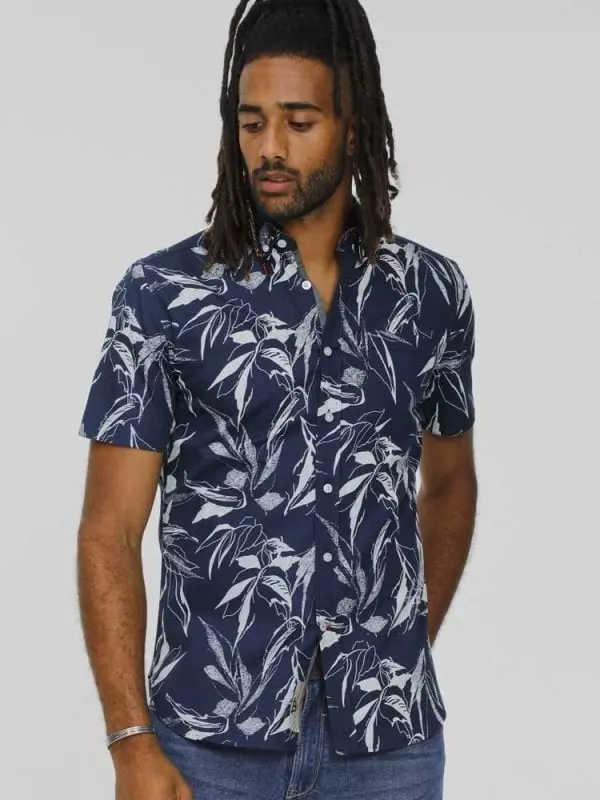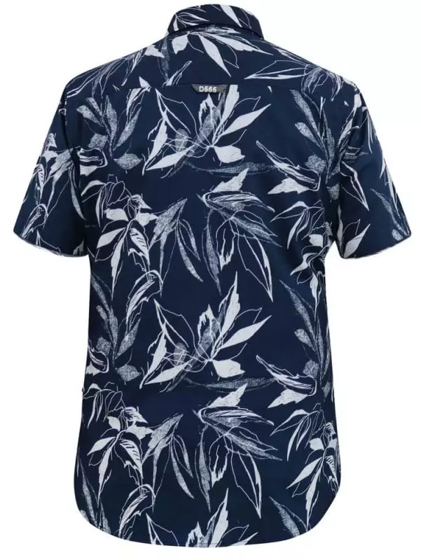 D555 korte mouw Hawaii overhemd met borstzak en kraag button down in donkerblauw met wit blad design. De kwaliteit van dit overhemd is 100% katoen.