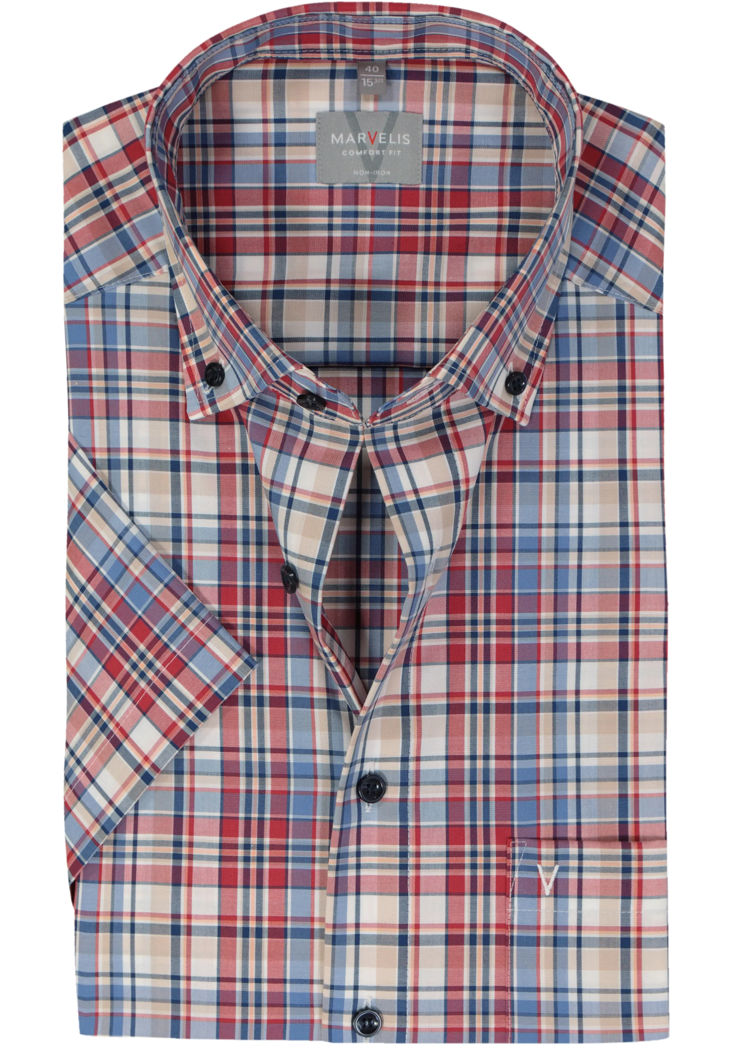 Marvelis overhemd korte mouw in een rood, beige, blauw en wit ruit design. Overhemd heeft een borstzakje en kraag met button down. 100% katoen strijkvrij in model comfort fit.
