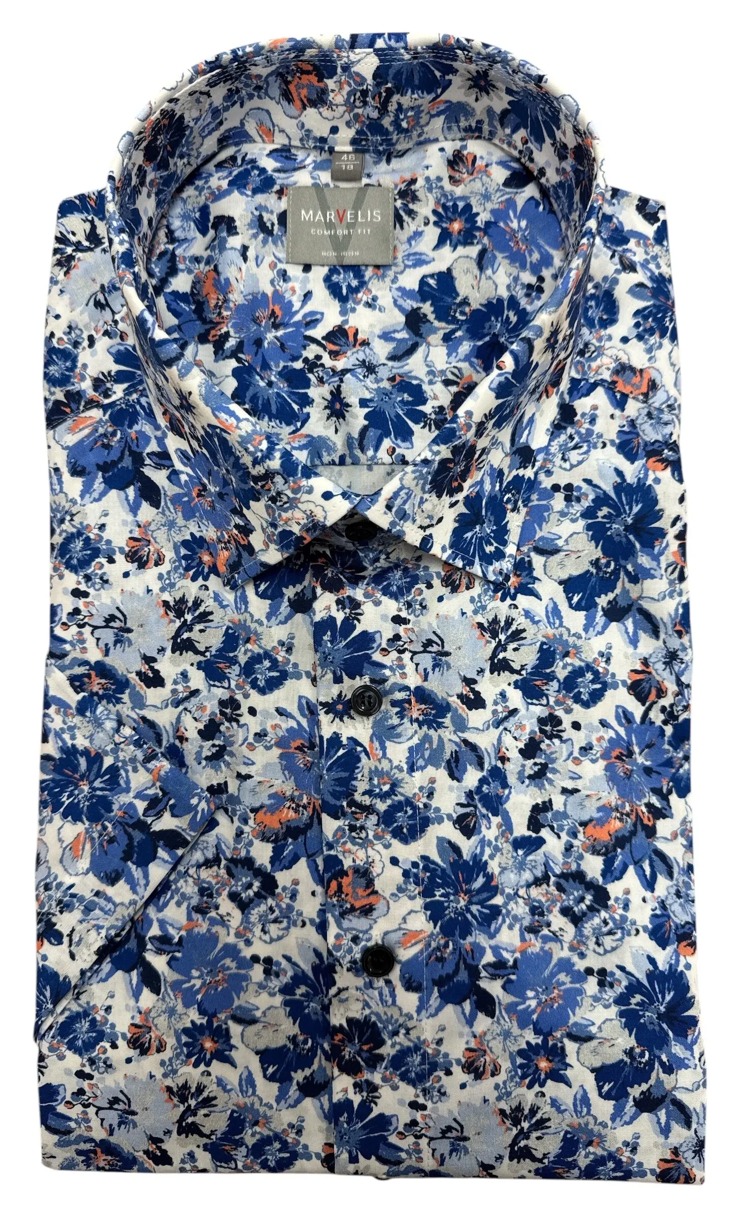 Marvelis overhemd korte mouw in een blauw, wit en blush bloem design. Overhemd is gemaakt van 100% katoen strijkvrij. Marvelis overhemd in model comfort fit.