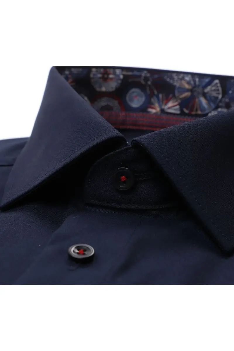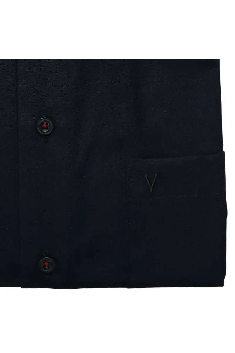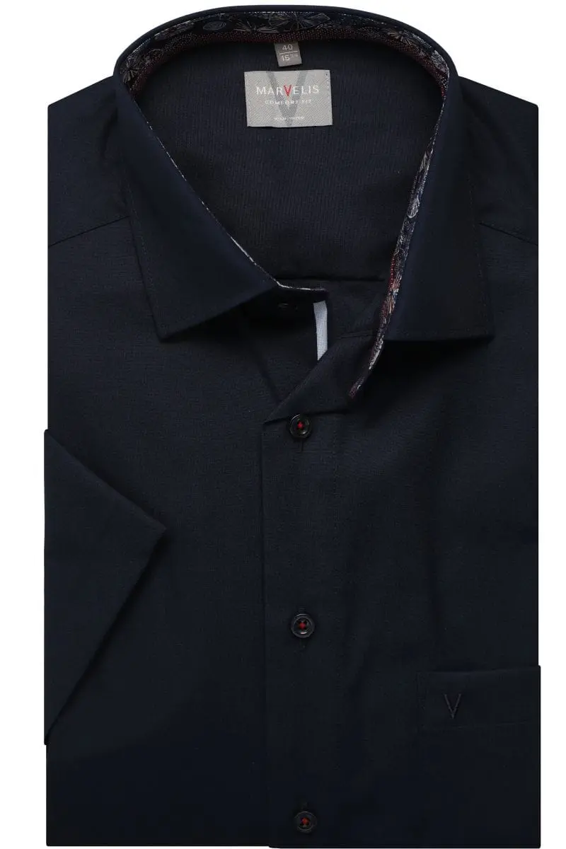 Marvelis overhemd met korte mouw donkerblauw afgezet langs de sluiting en binnenkant boord met een contrasterend stofje. Overhemd heeft een borstzakje en is gemaakt van 100% katoen strijkvrij. Marvelis overhemd in model comfort fit.