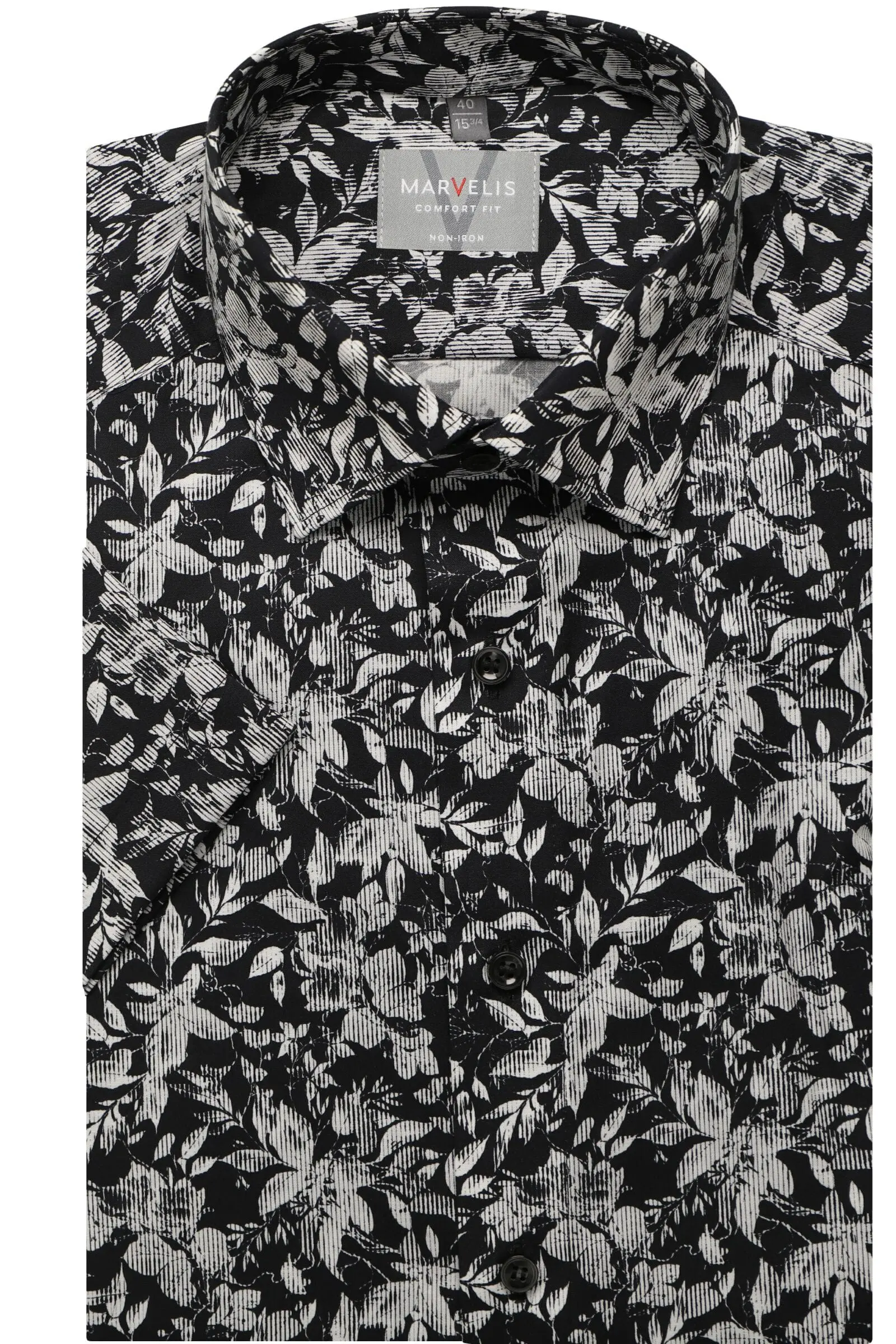 Marvelis overhemd korte mouw in een zwart en wit fantasie design. Overhemd in gemaakt van 100% katoen strijkvrij. Marvelis overhemd in model comfort fit.