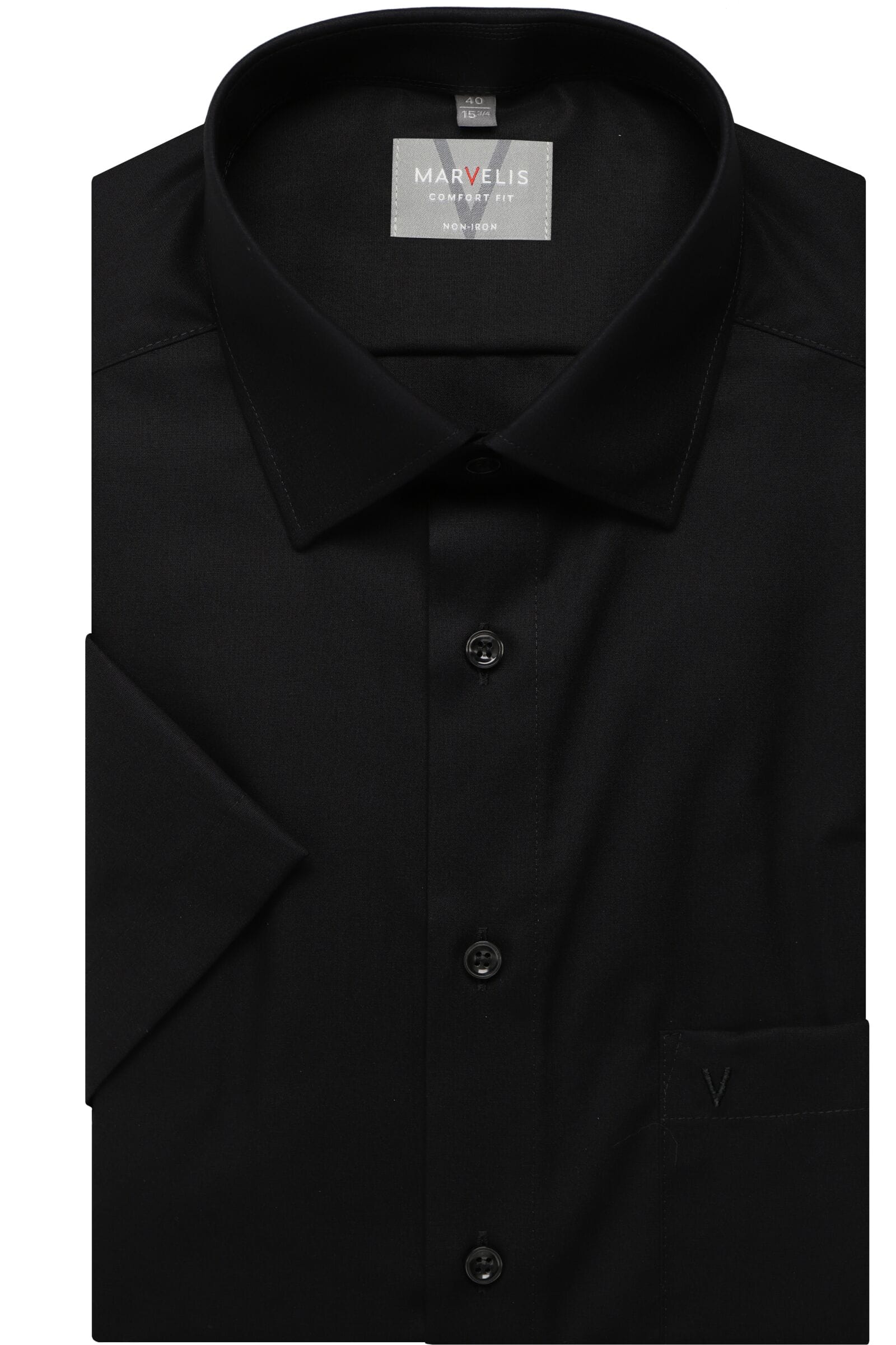 Marvelis overhemd met korte mouw in uni zwart strijkvrij. Overhemd heeft een borstzakje en is gemaakt van 100% katoen strijkvrij in model comfort fit.