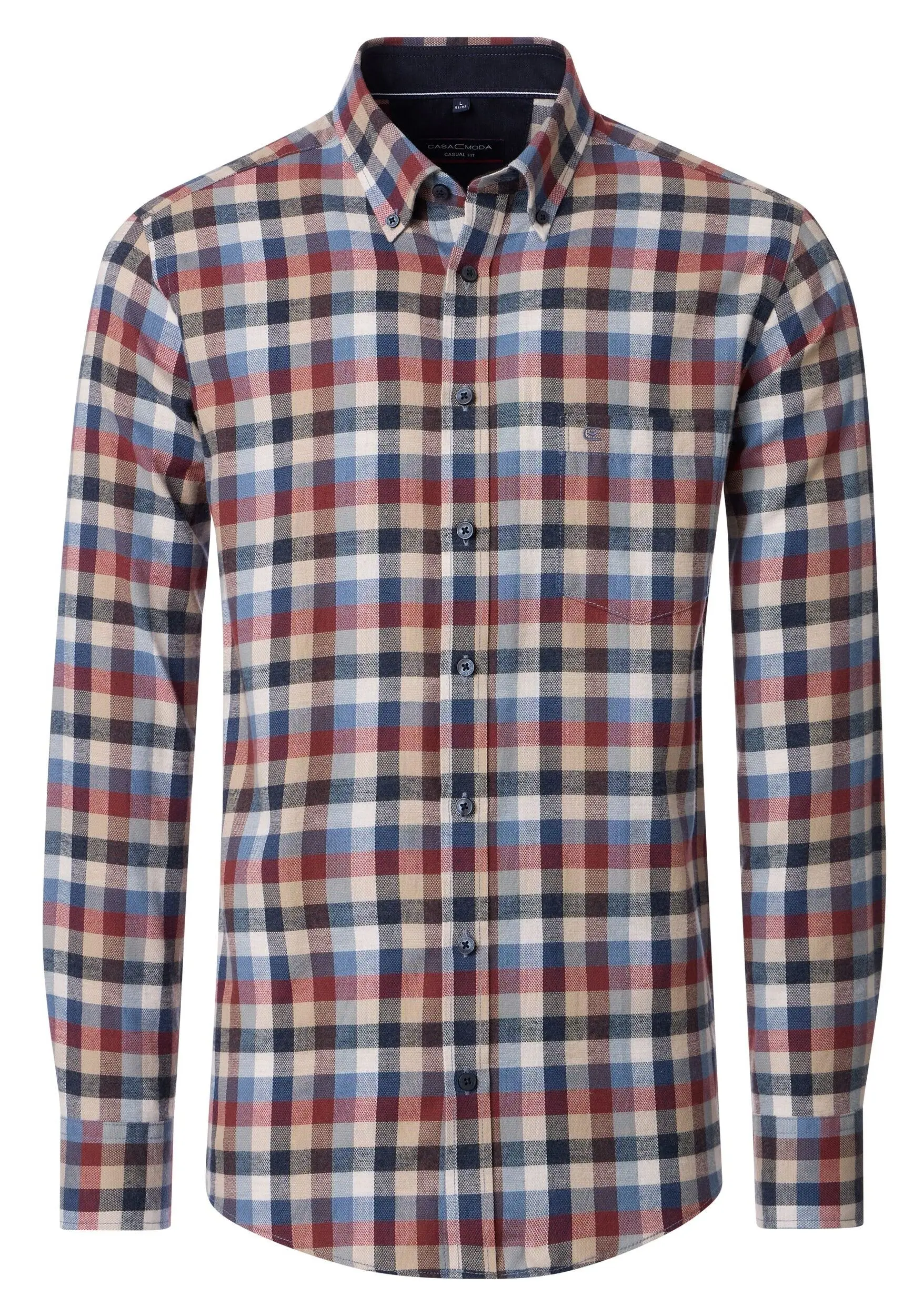 Casa Moda overhemd lange mouw met borstzak in een blauw, donkerrood en beige ruit design met kraag button down. Model comfort fit 100% katoen in flanel.