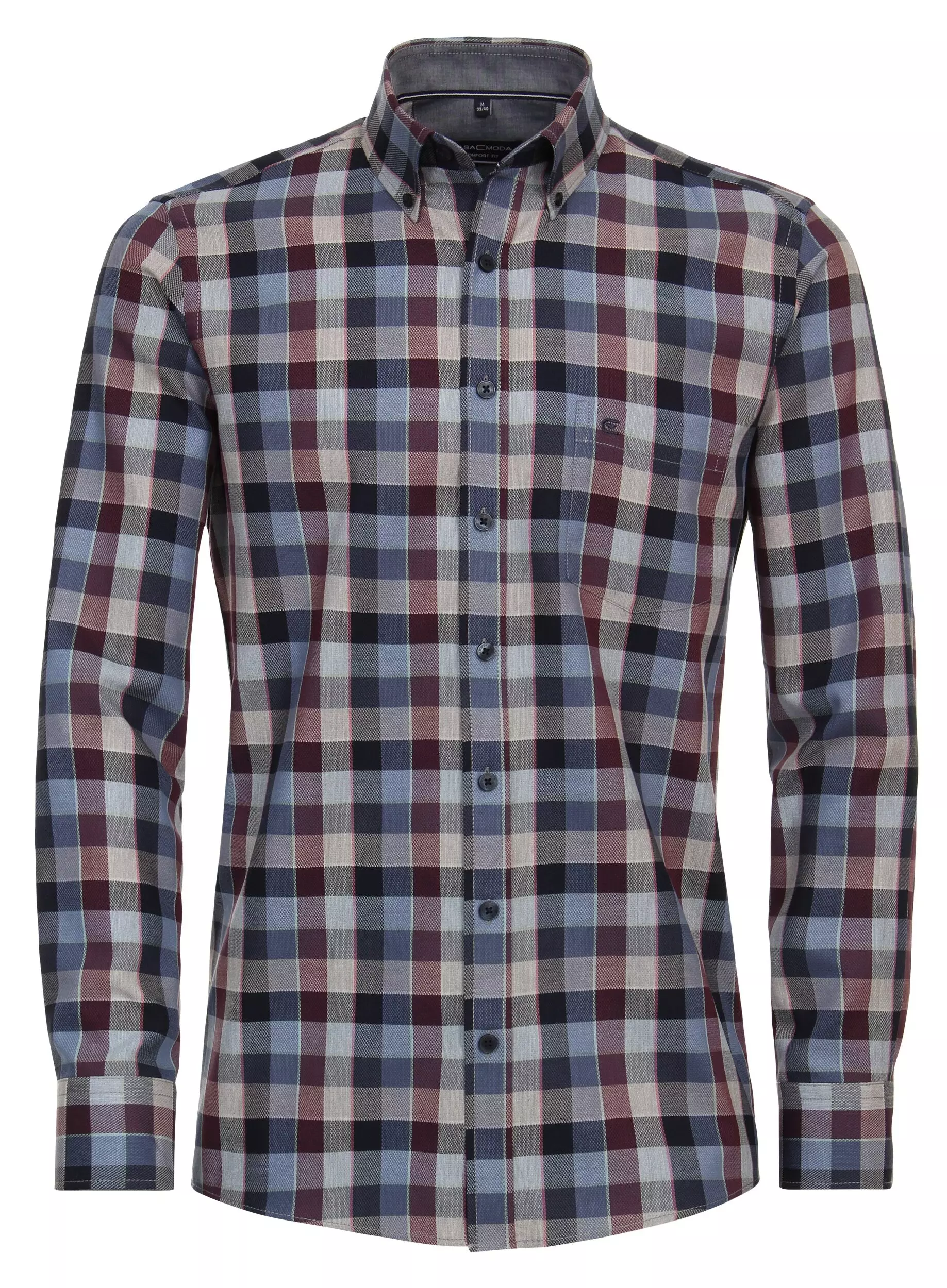Casa Moda overhemd lange mouw met borstzak in een meer bordeauxrood, blauw en grijze ruit met kraag button down. Model comfort fit 100%katoen