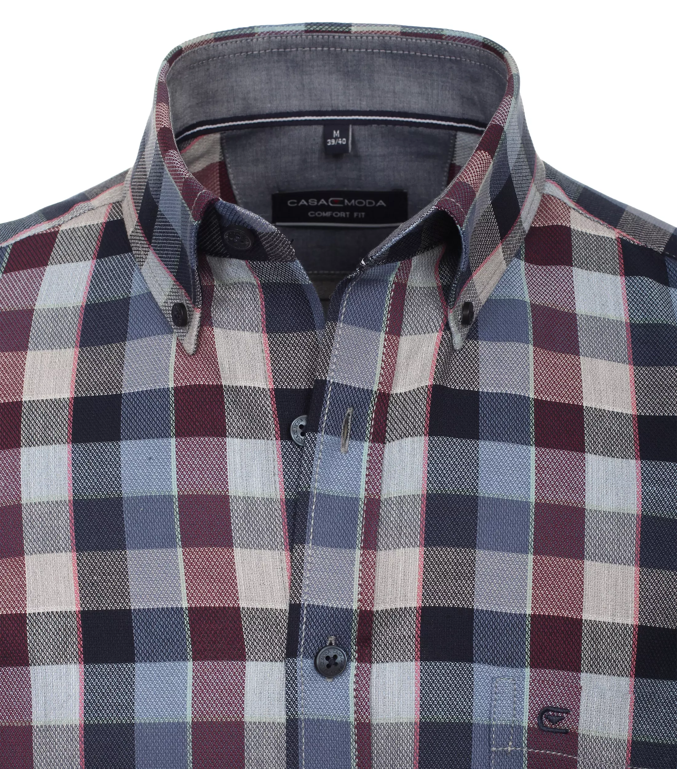 Casa Moda overhemd lange mouw met borstzak in een meer bordeauxrood, blauw en grijze ruit met kraag button down. Model comfort fit 100%katoen