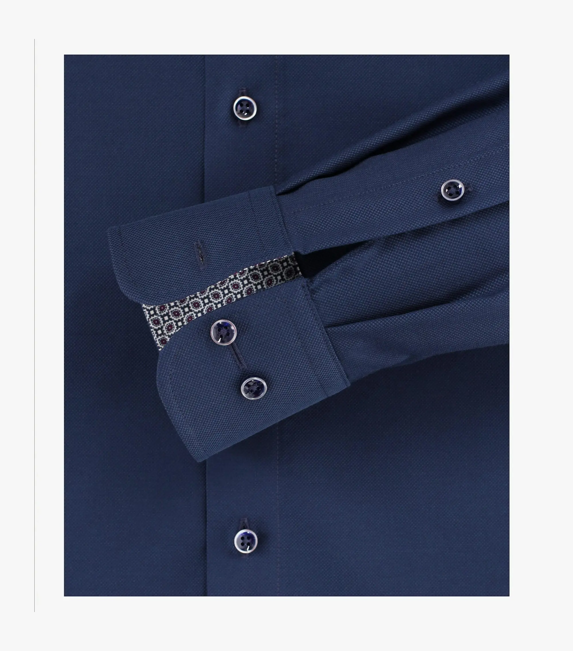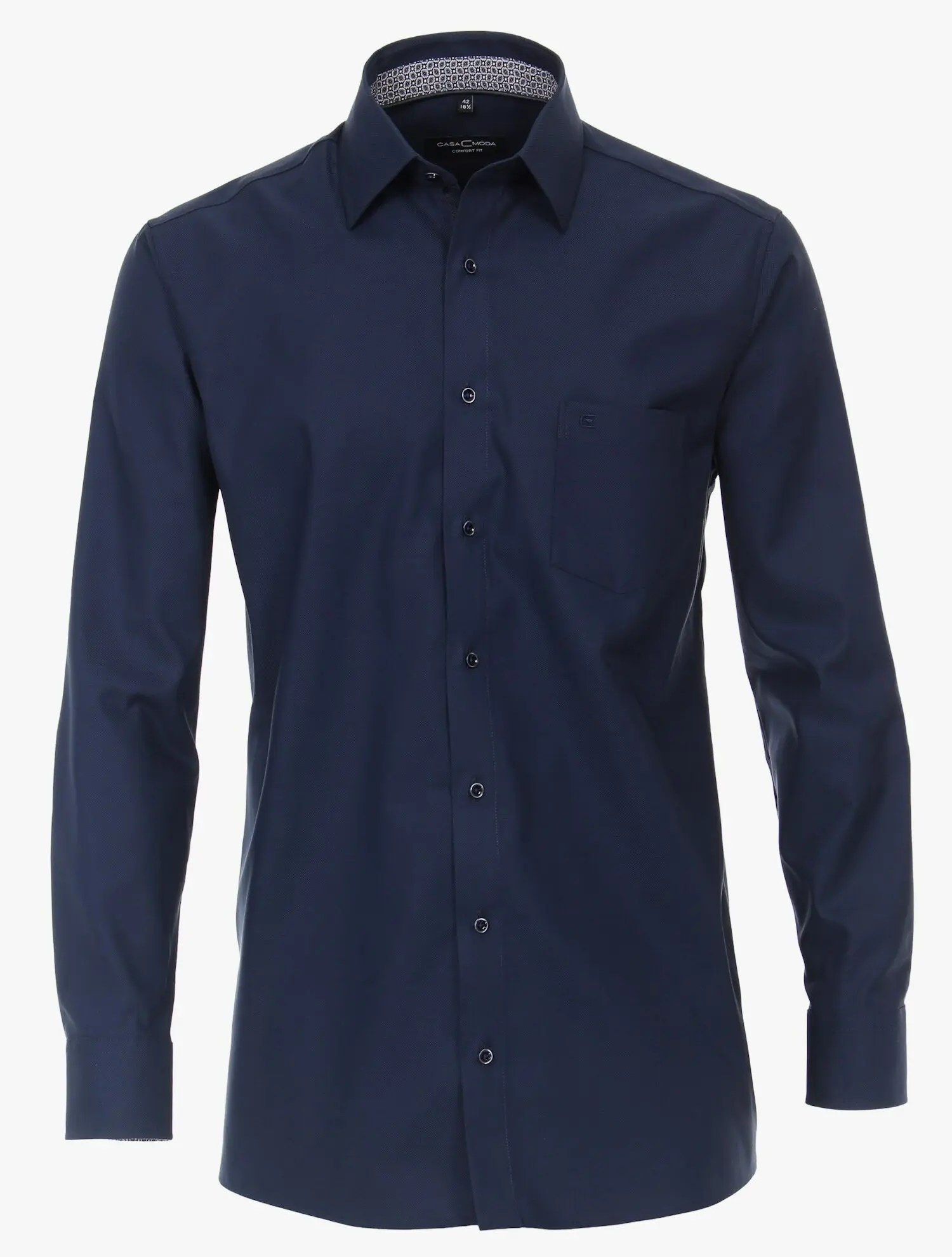 Casa Moda overhemd lange mouw met borstzakje in donkerblauw met ingeweven structuur. Binnenkant kraag en manchetten zijn afgewerkt met een contrasterend stofje. Model comfort fit in 100% katoen strijkvrij.