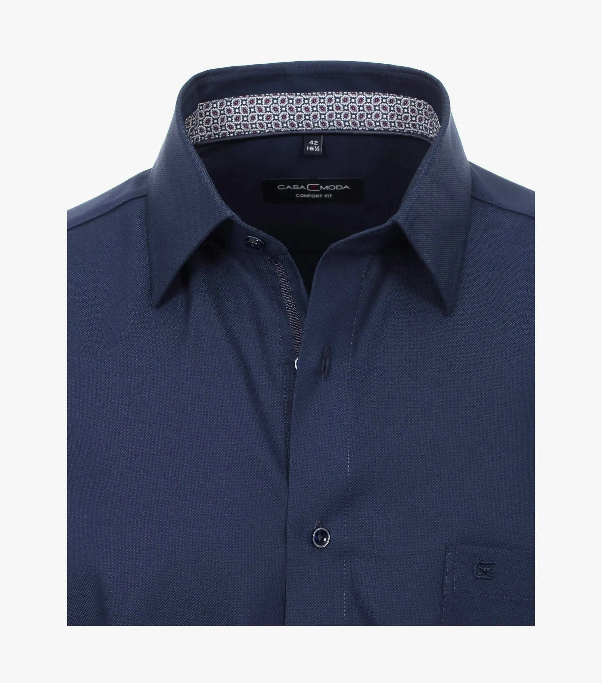 Casa Moda overhemd lange mouw met borstzakje in donkerblauw met ingeweven structuur. Binnenkant kraag en manchetten zijn afgewerkt met een contrasterend stofje. Model comfort fit in 100% katoen strijkvrij.