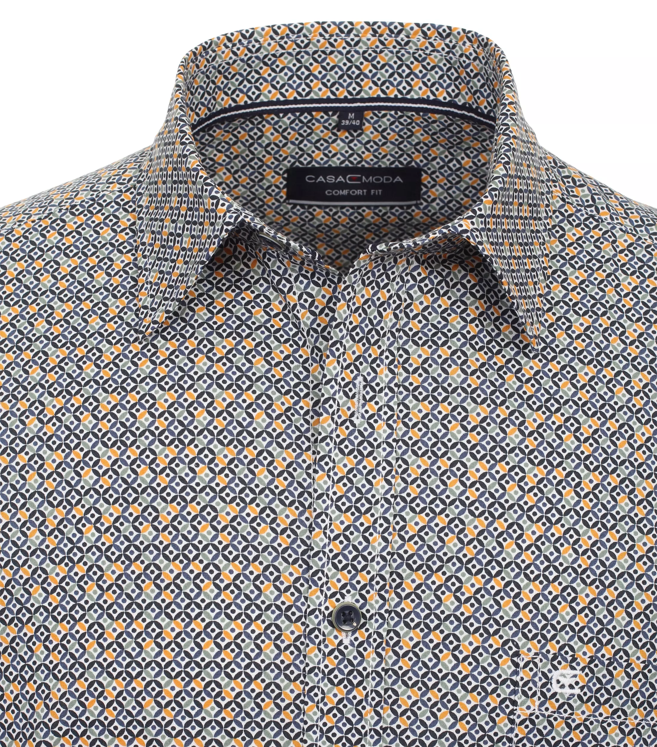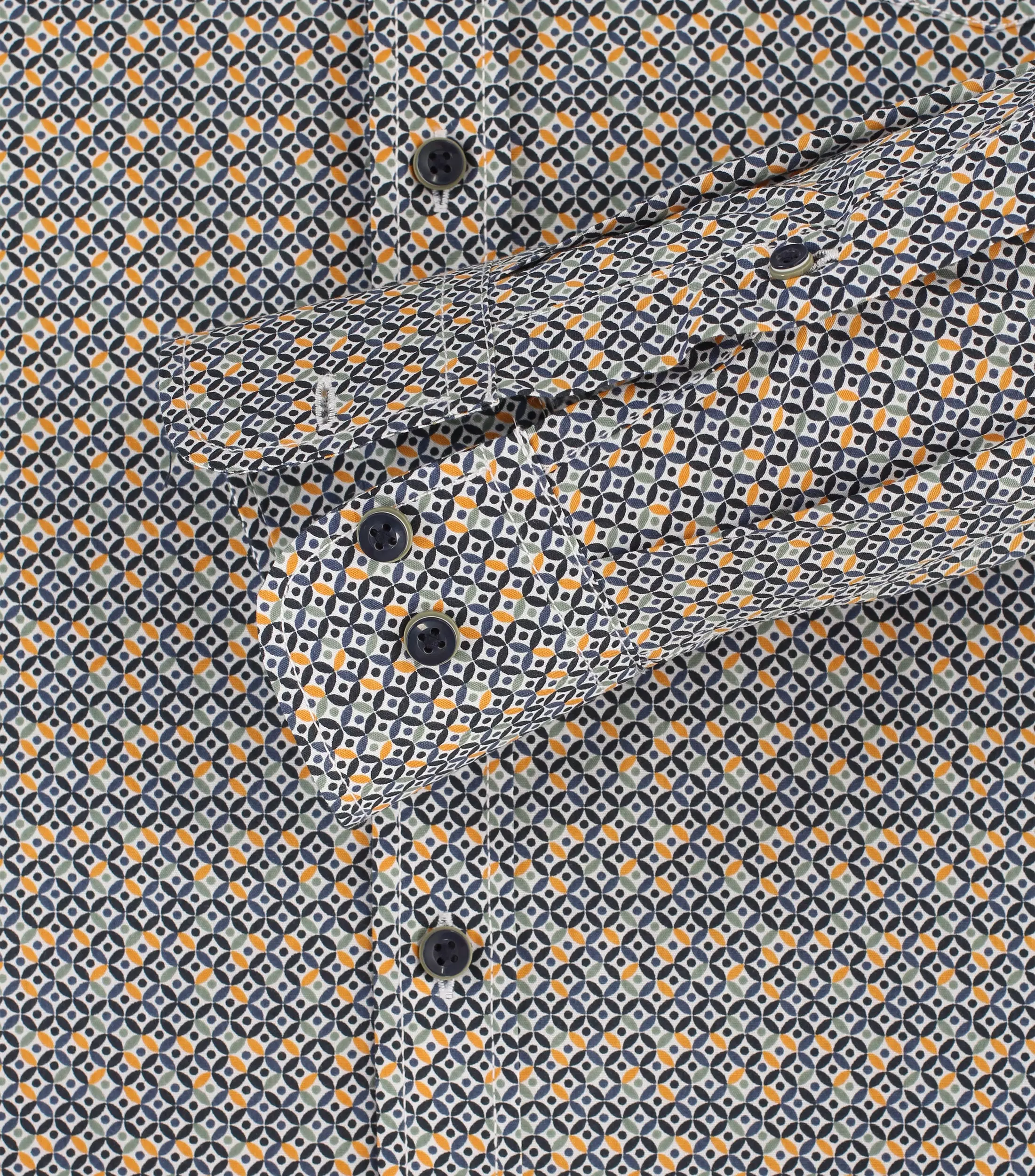 Casa Moda overhemd lange mouw met borstzak in oranje, blauw, groen en wit cirkel fantasie design. Model comfort fit 100%katoen.