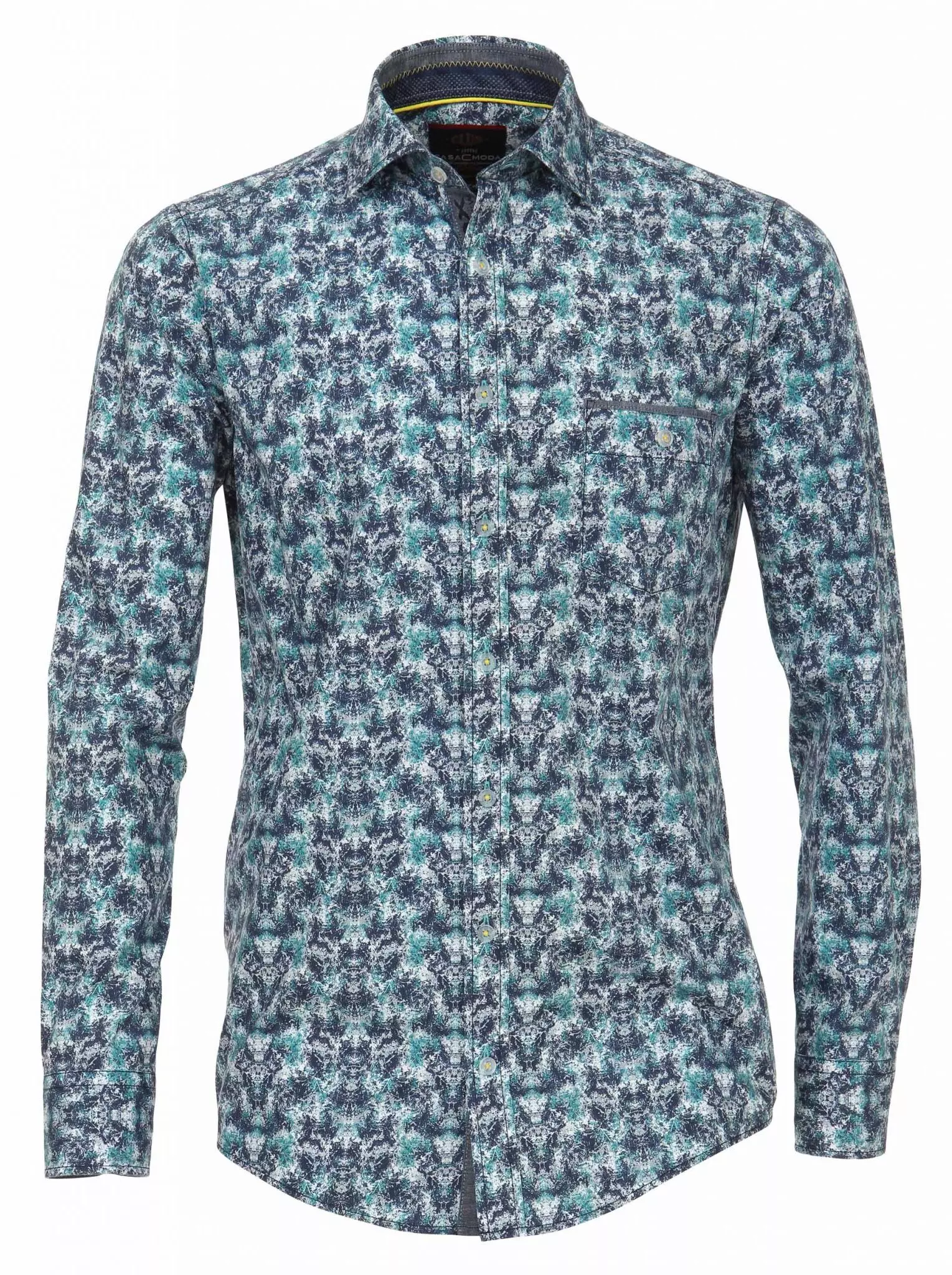 Casa Moda overhemd lange mouw in een blauw en petrol fantasie motief. Binnenkant kraag en manchetten met een contrasterend stofje afgewerkt. Op de linkerkant van de borst een borstzakje. Model casual fit in 100% katoen stretch.