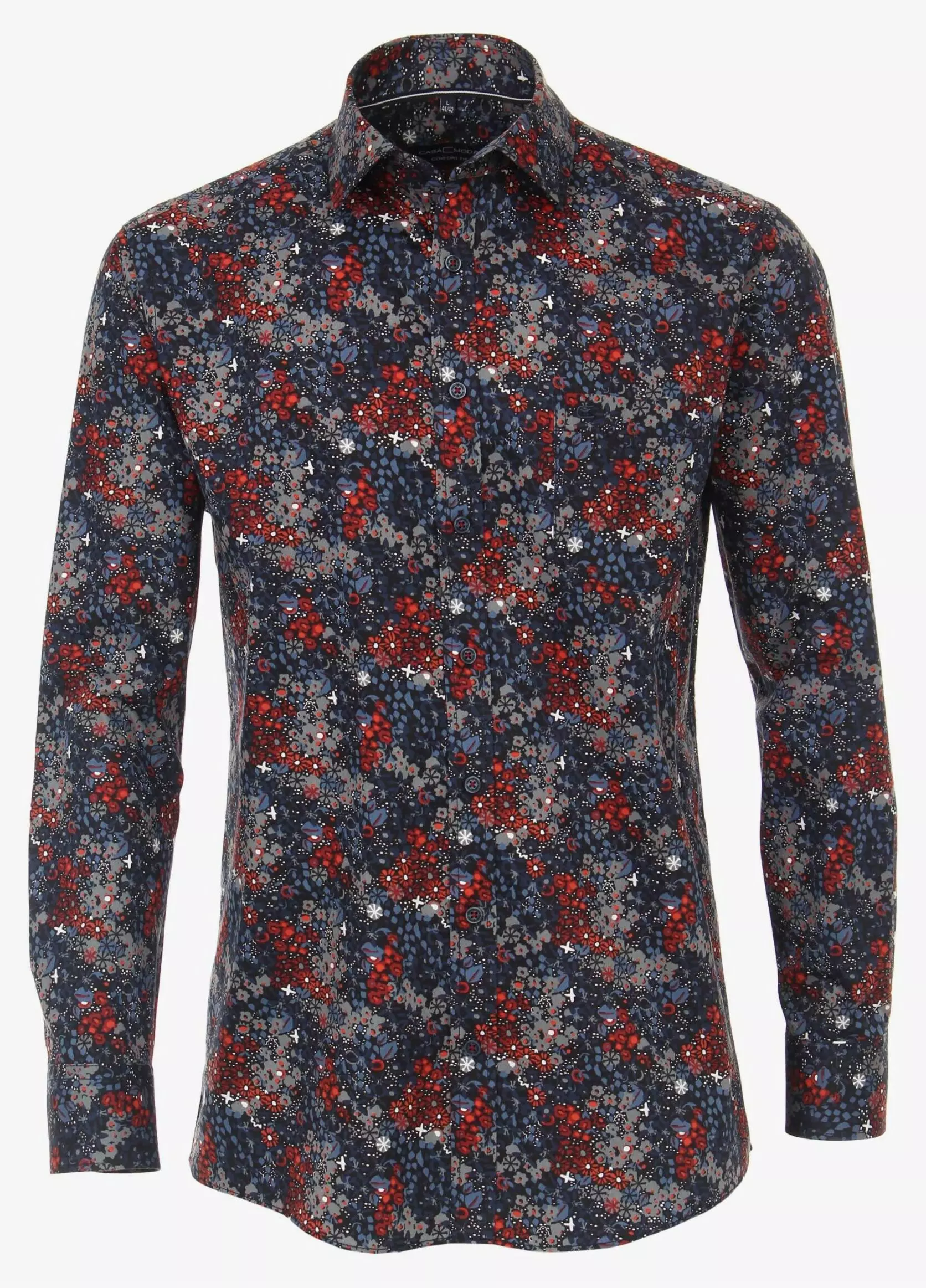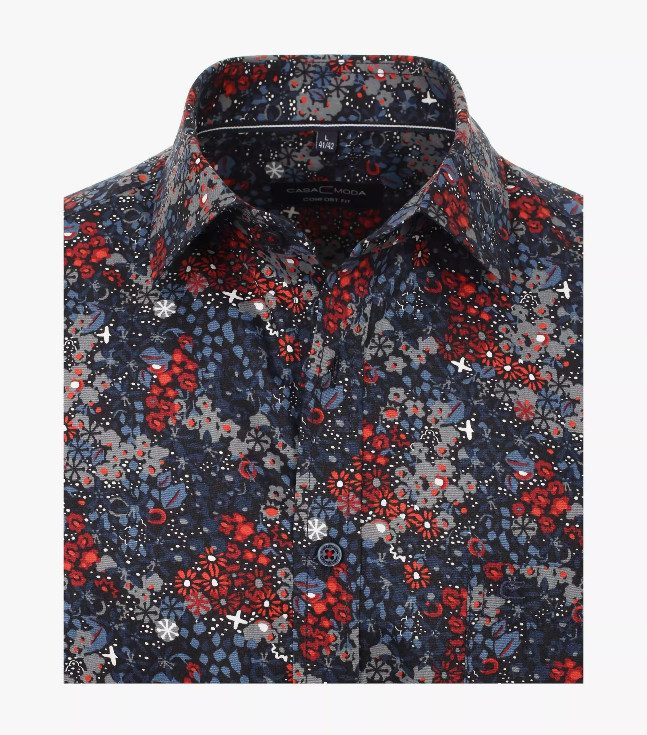 Casa Moda overhemd lange mouw met borstzakje in een blauw en rood fantasie patroon. Model comfort fit 100%katoen.