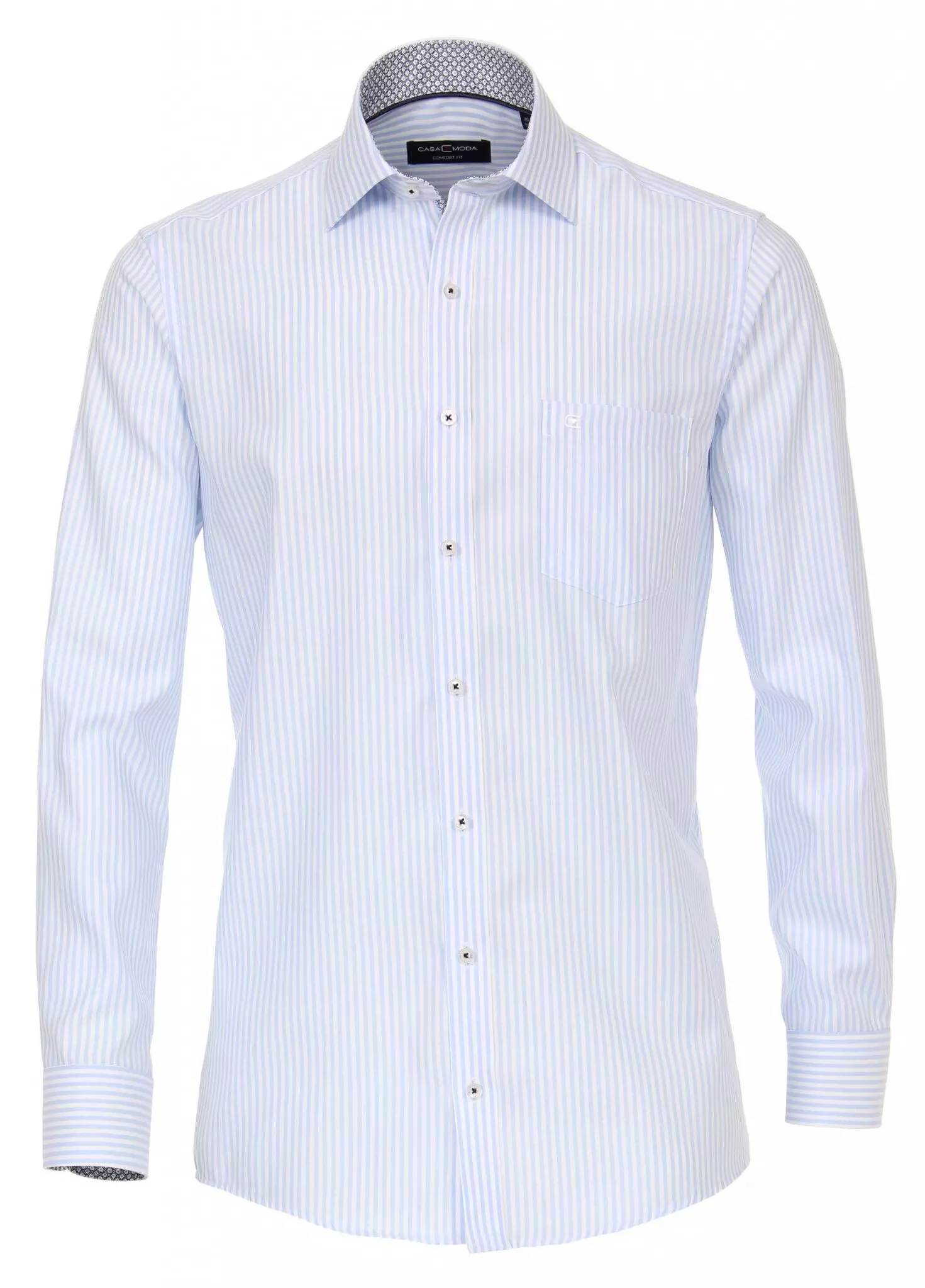 Casa Moda overhemd lange mouw in blauw met witte lengte streep. Overhemd comfort fit met borstzakje. Binnenkant kraag en manchetten afgewerkt met contrasterend stofje. De kwaliteit is 100% katoen strijkvrij.