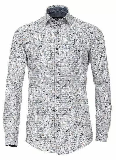 Casa Moda overhemd lange mouw in een blauw en camel fantasie motief. Binnenkant kraag en manchetten met een contrasterend stofje afgewerkt. Op de linker kant van de borst een borstzakje. Model casual fit in 100% katoen.