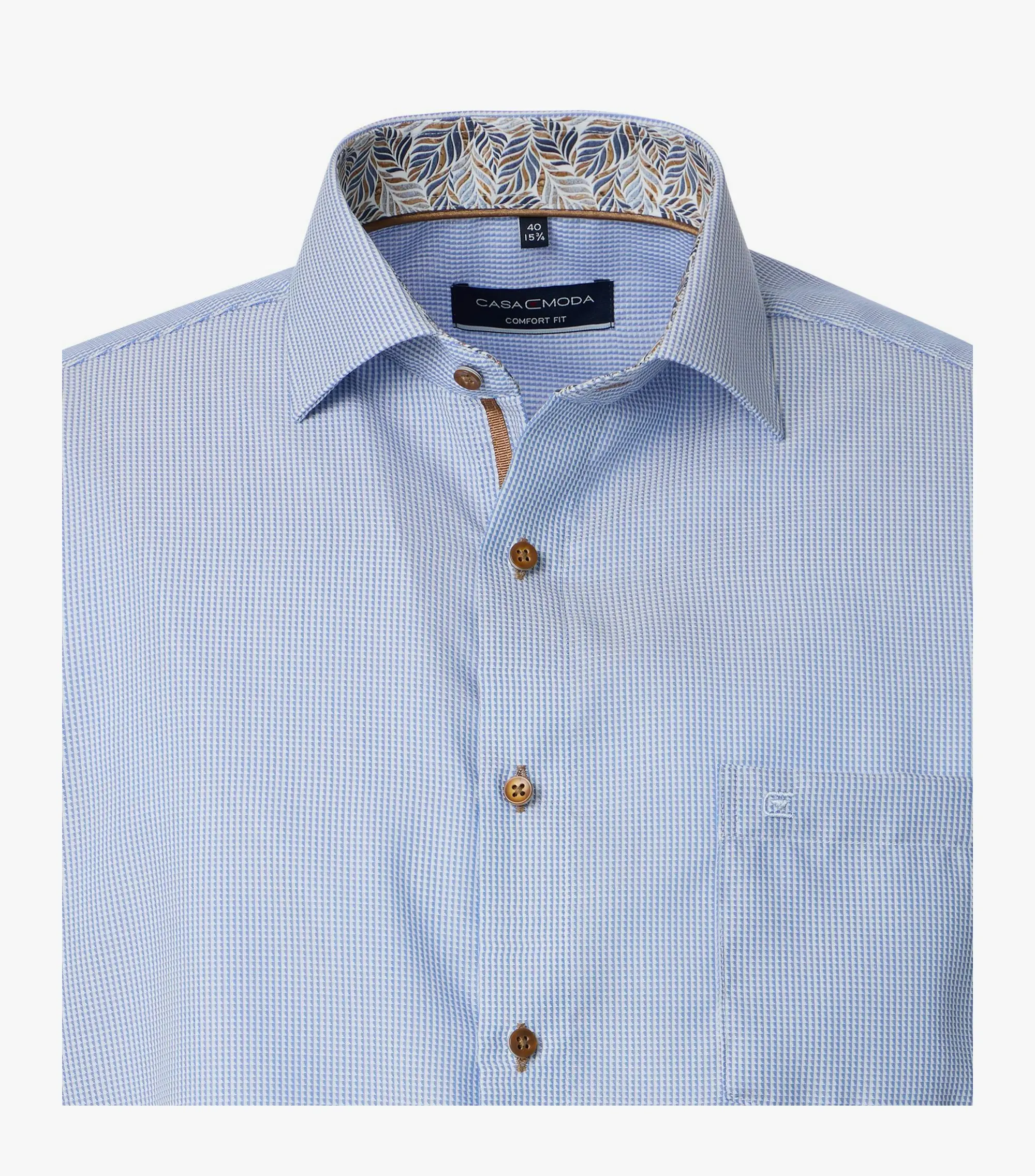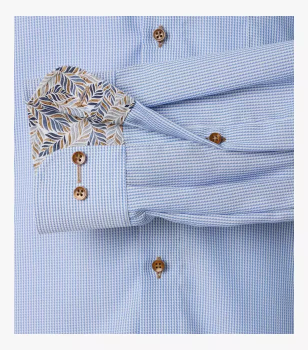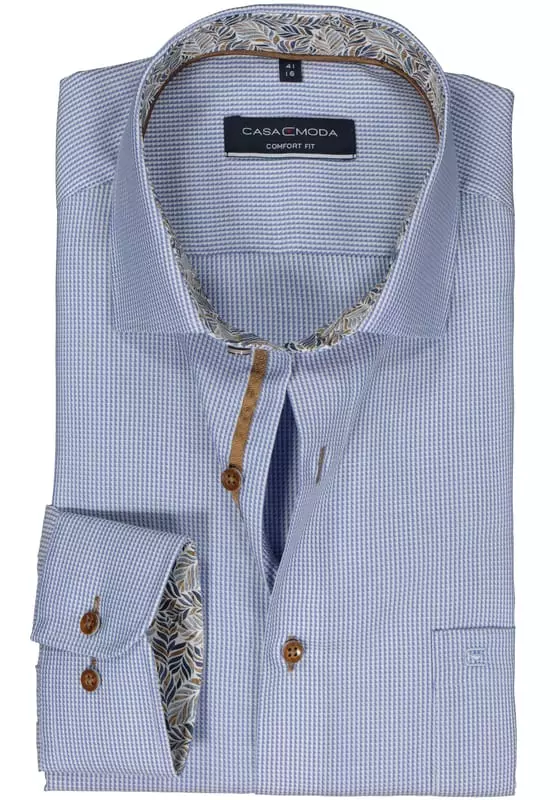 Casa Moda overhemd lange mouw met borstzakje in een blauw fantasie design. Overhemd met is met aan de binnenkant kraag en manchetten afgewerkt met een contrasterend stofje. 100% katoen model comfort fit strijkvrij.