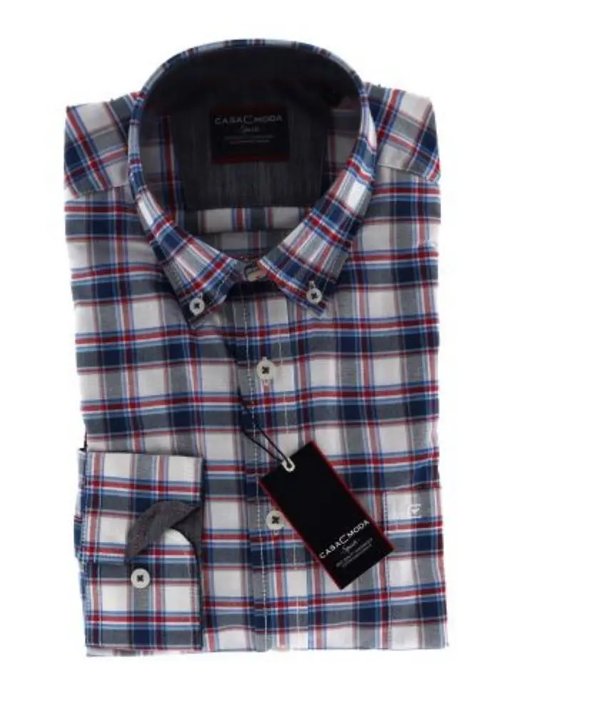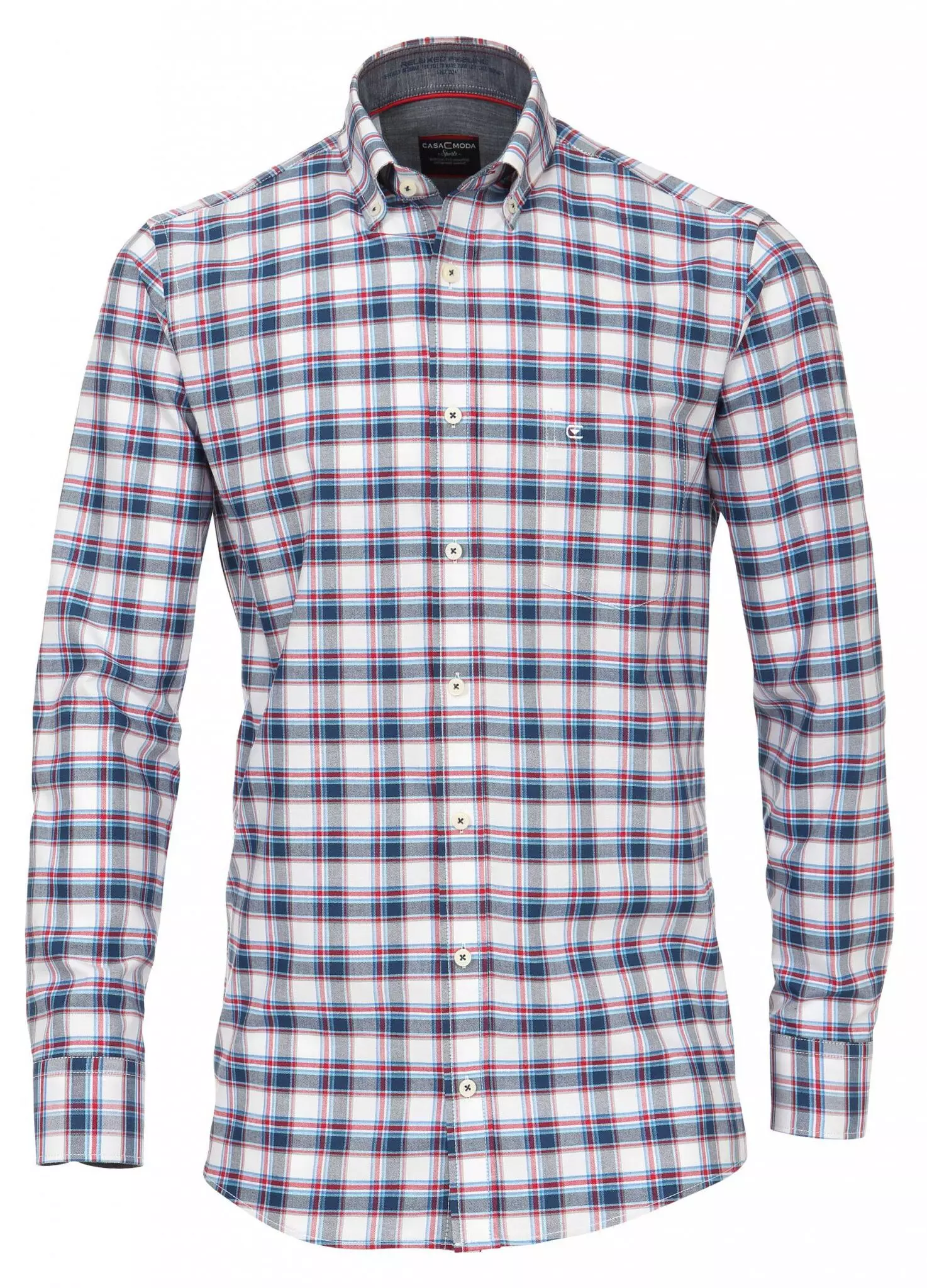 Casa Moda overhemd lange mouw met borstzakje in een rood, wit en blauwe ruit met kraag button down. Binnenkant kraag en manchetten afgewerkt met een contrasterend stofje. 100% katoen.