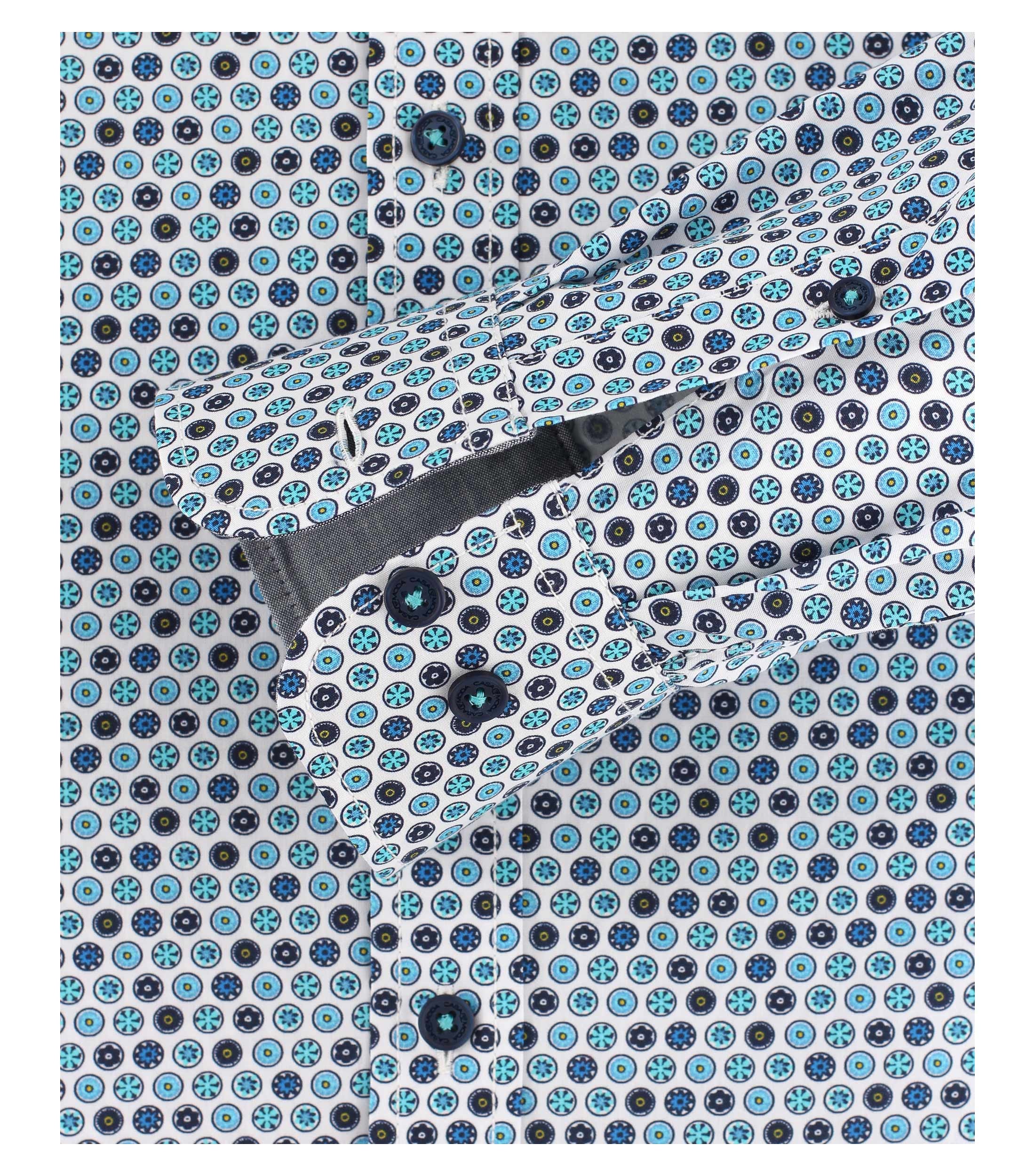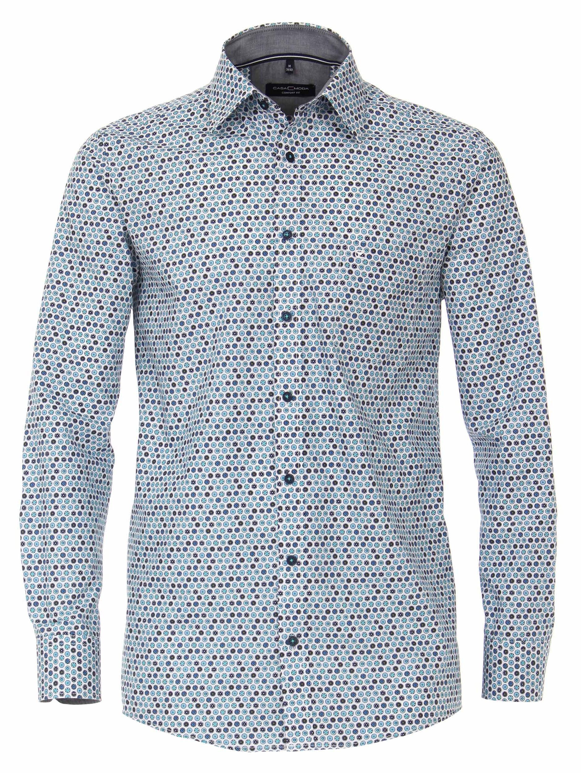 Casa Moda overhemd lange mouw in een turquoise, wit en blauw fantasie cirkel patroon. Binnenkant kraag en manchetten zijn afgewerkt met contrasterend stofje. Op de linkerkant van de borst een borstzakje. Model comfort fit 100% katoen easy care.