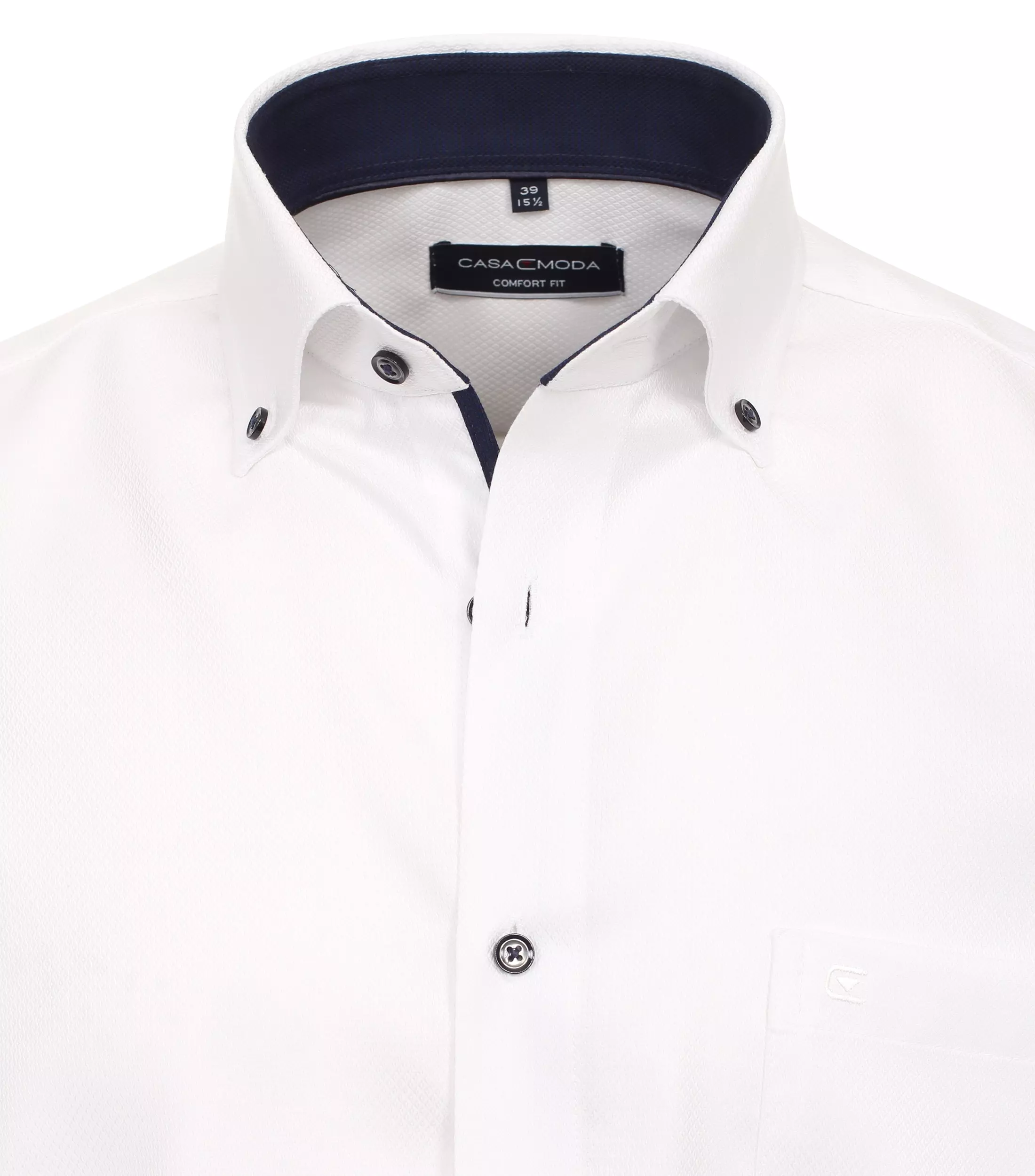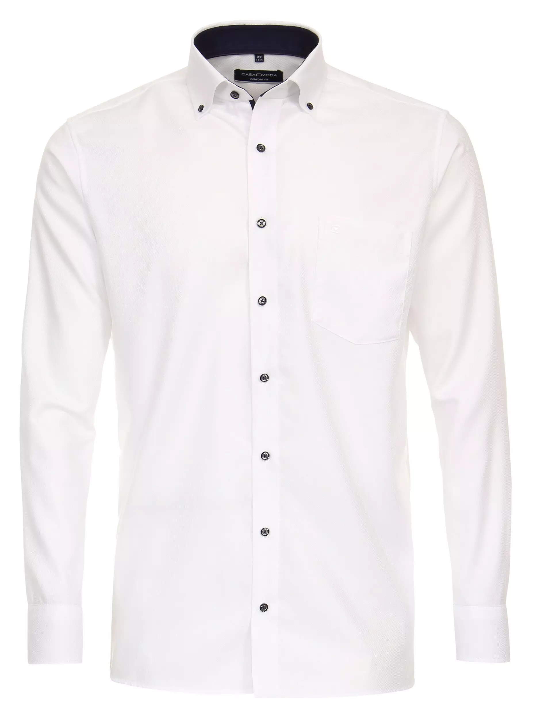Het witte Casa Moda overhemd is voorzien van een subtiel ingeweven griot ruitje. Dit ruitpatroon geeft het overhemd een klassieke, maar toch moderne uitstraling die geschikt is voor zowel formele als informele gelegenheden. Het ingeweven ruitje voegt een speels detail toe zonder dat het overhemd zijn verfijnde uitstraling verliest. Dit maakt het overhemd een veelzijdige keuze, perfect voor mannen die stijl bewust zijn en een nette, verzorgde look willen behouden.Button-Down Kraag met Stijlvolle Afwerking