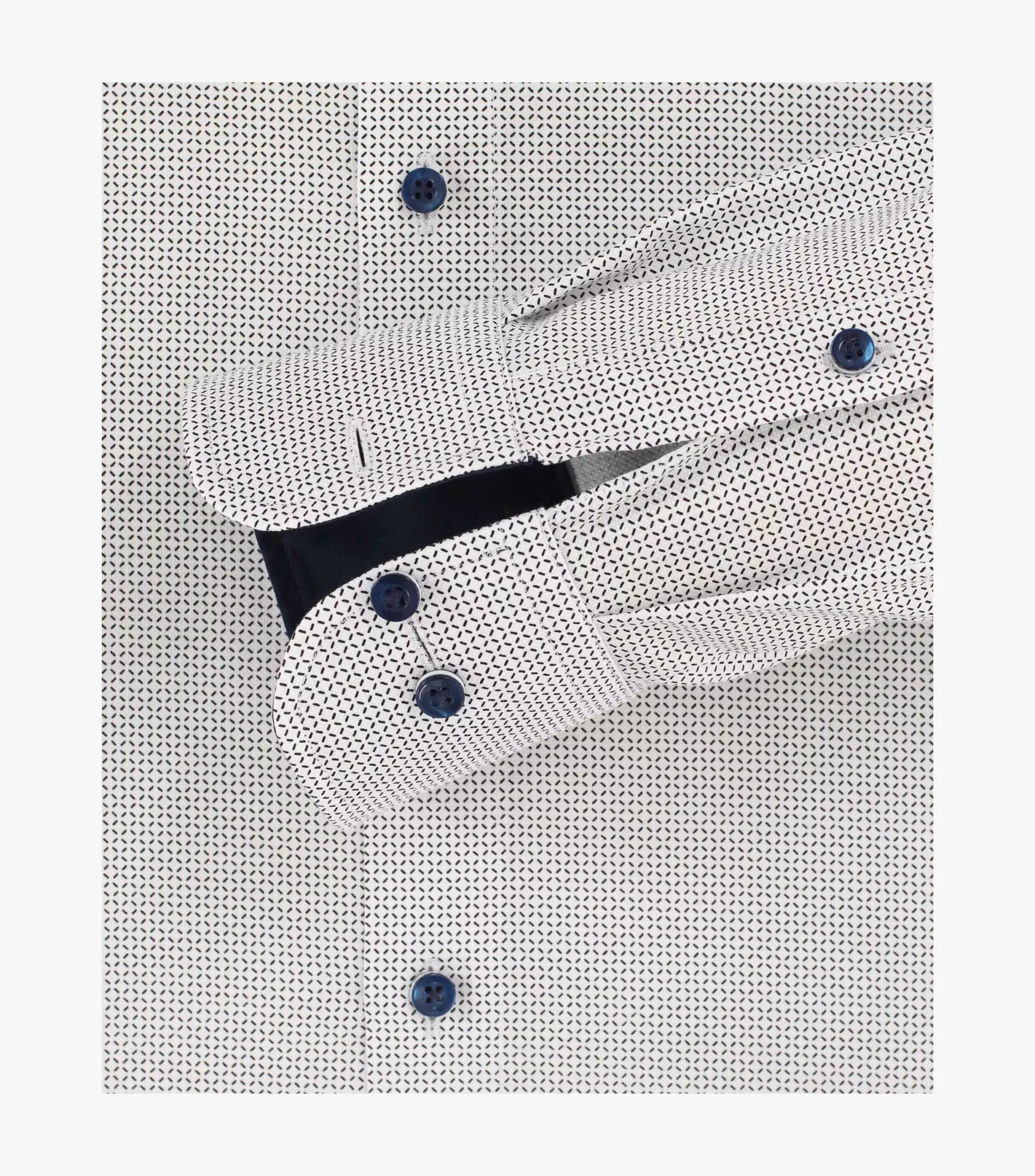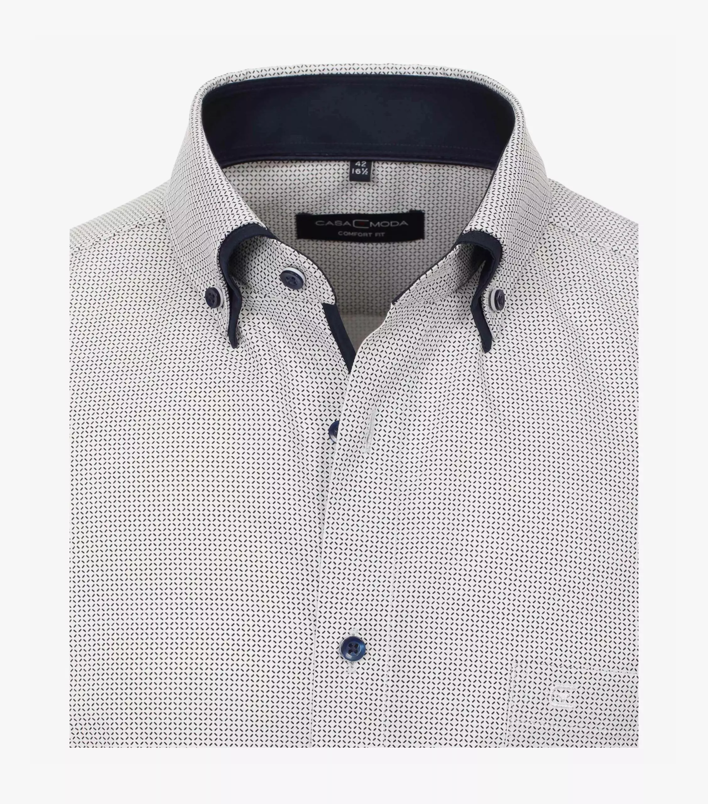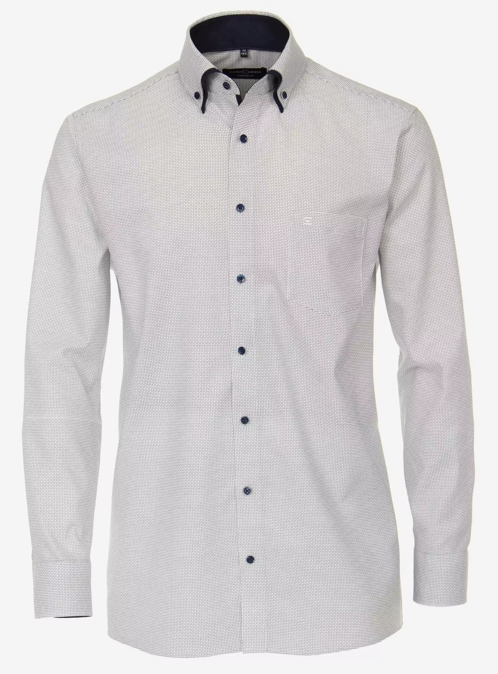 Casa Moda overhemd lange mouw wit met donkerblauw fantasie patroon en dubbele kraag button down. Binnenkant kraag en manchetten zijn afgewerkt met contrasterend stofje. Op de linkerkant van de borst een borstzakje. Model comfort fit 100% katoen strijkvrij.