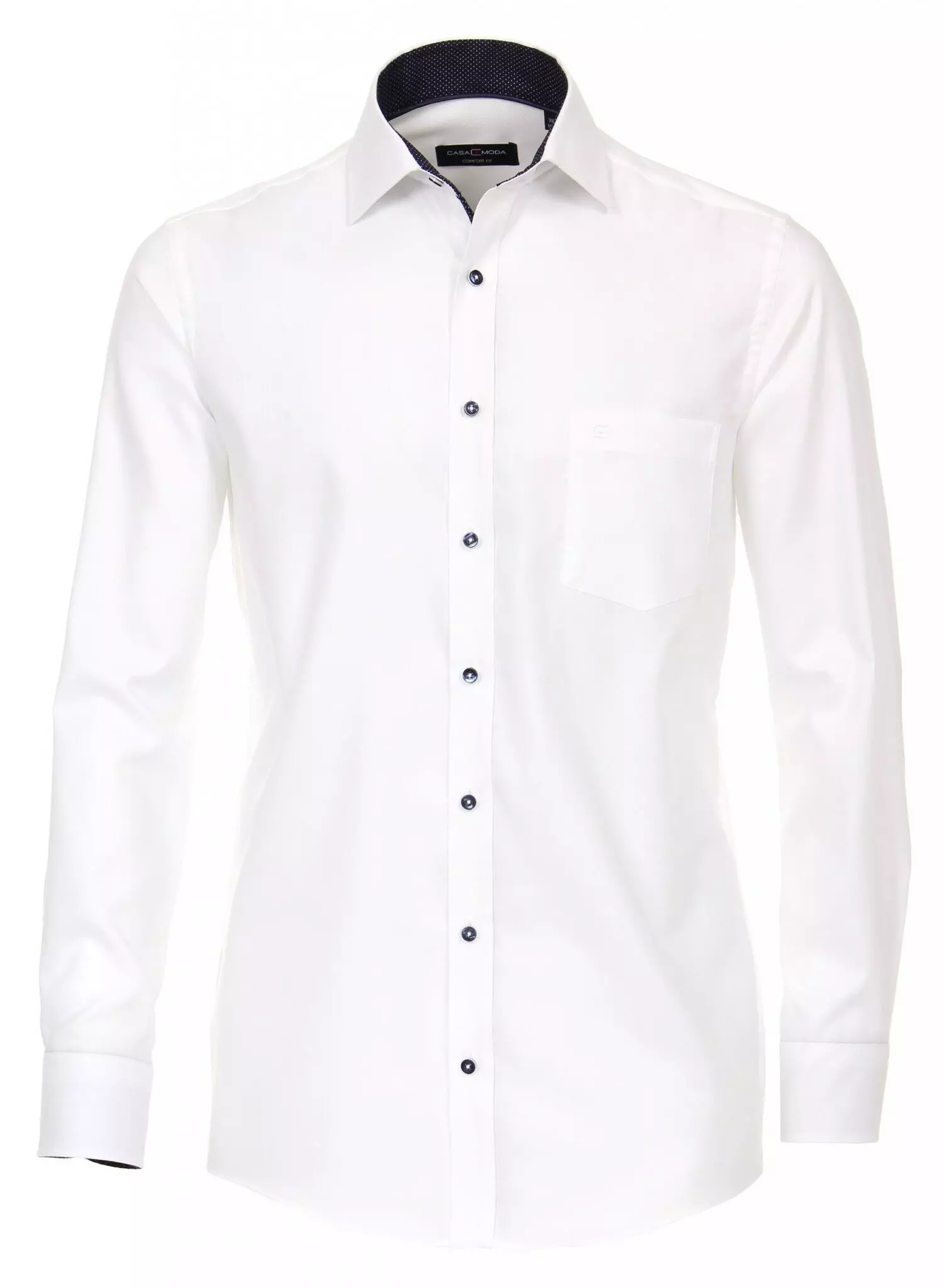 Casa Moda overhemd lange mouw in wit met blauwe knoopjes met een ingeweven structuur 100% strijkvrij. Overhemd comfort fit met borstzakje. Binnenkant boord en manchetten zijn afgewerkt met een contrasterend stofje. De kwaliteit is 100% katoen strijkvrij