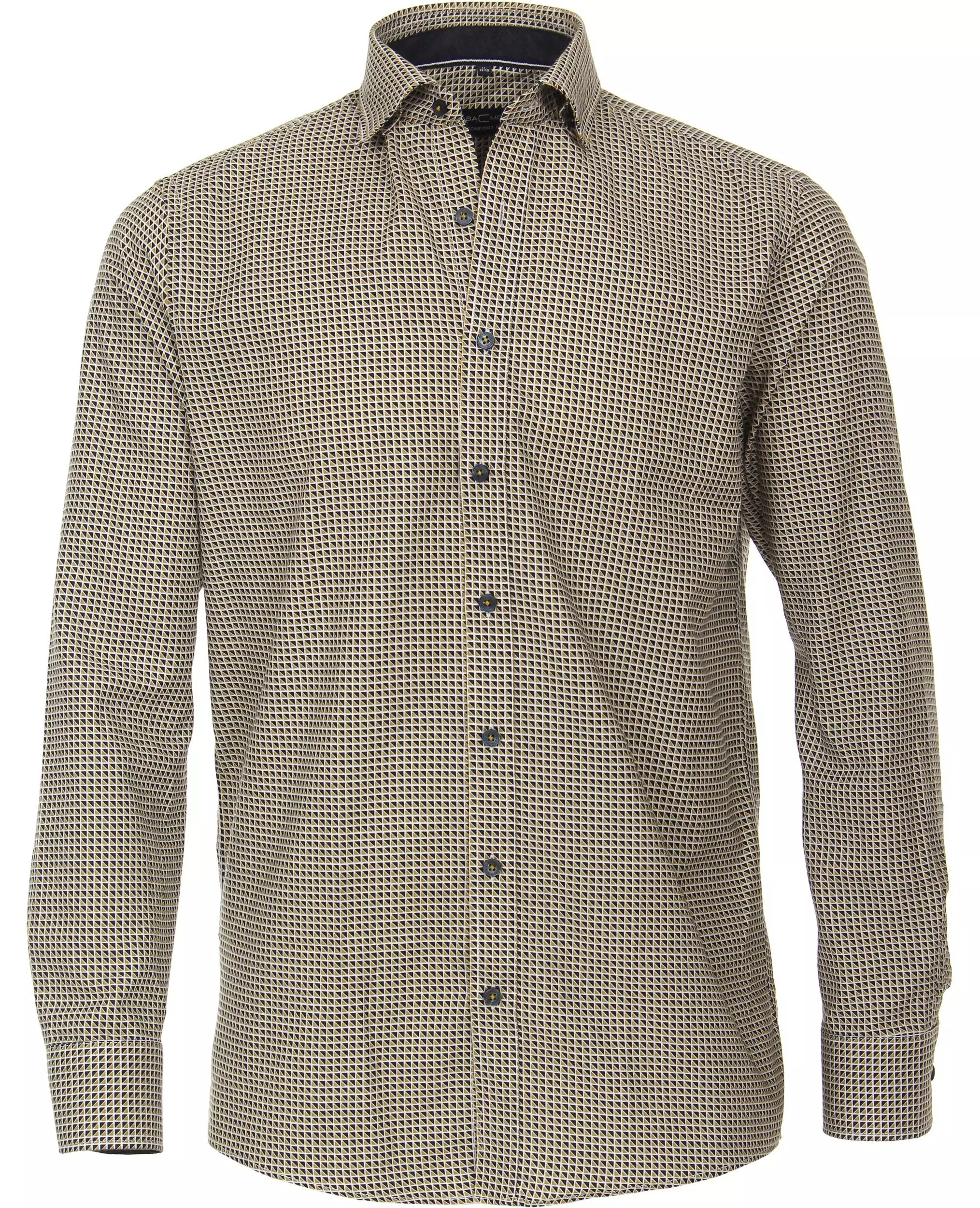 Casa Moda overhemd lange mouw zonder borstzakje in okergeel, zwart en wit fantasie patroon. Kraag met under button down. Binnenkant kraag en manchetten zijn met een contrasterend stofje afgewerkt. Model comfort fit in 100%katoen.